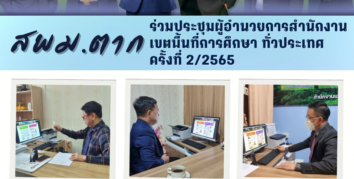วันที่ 2 มีนาคม 2565 ดร.อวยชัย ศรีตระกูล ผอ.สพม.ตาก พร้อมด้วย นายวัลลภ เอี่ยมมะ รอง ผอ.สพม.ตาก และดร.ศราวุธ คำแก้ว รอง ผอ.สพม.ตาก ร่วมประชุมผู้อำนวยการสำนักงานเขตพื้นที่การศึกษา ทั่วประเทศ ครั้งที่ 2/2565 มีนโยบายเร่งด่วนของกระทรวงศึกษาธิการ จำนวน 3 เรื่อง ได้แก่