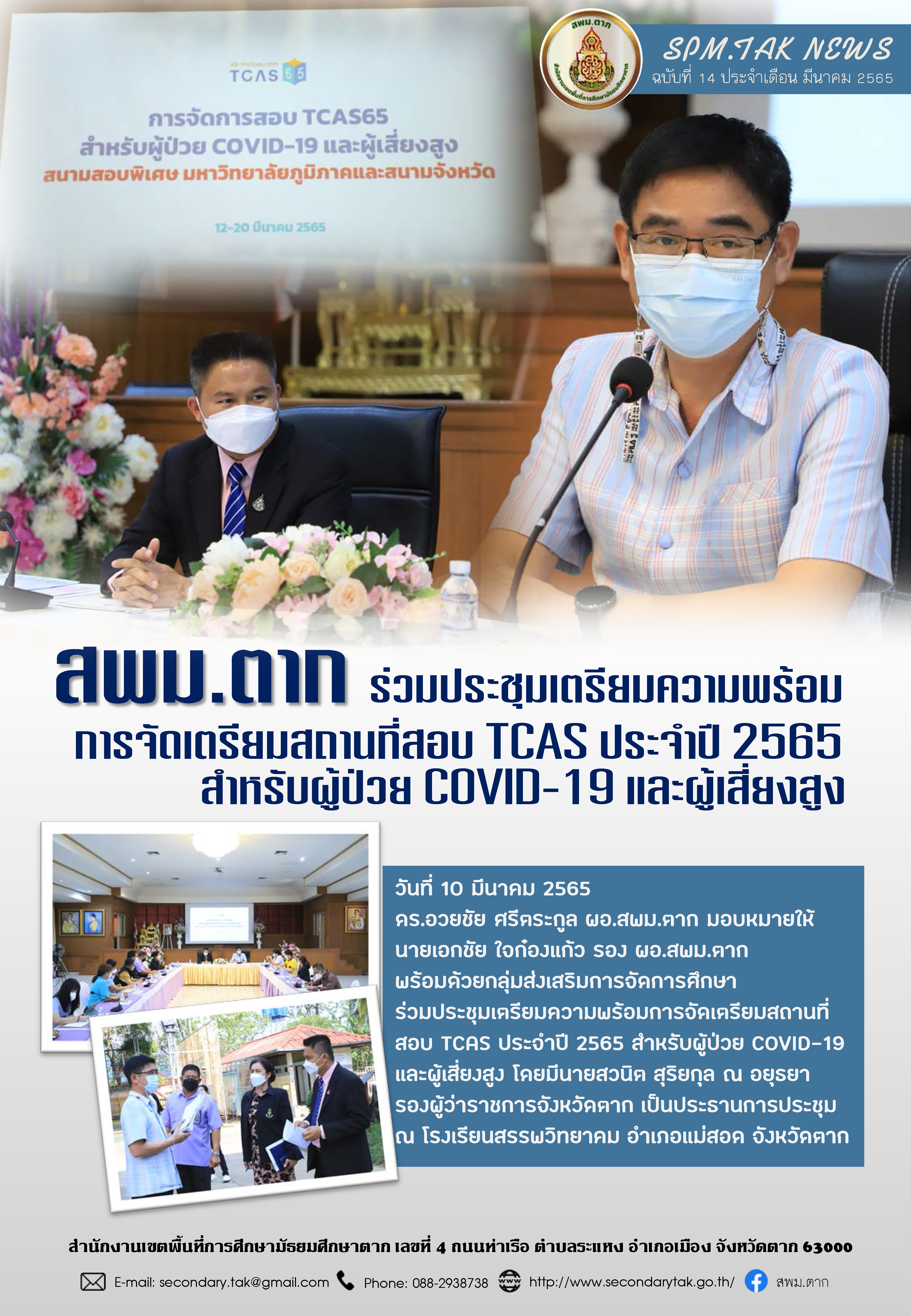 วันที่ 10 มีนาคม 2565 ดร.อวยชัย ศรีตระกูล ผอ.สพม.ตาก มอบหมายให้ นายเอกชัย ใจก๋องแก้ว รอง ผอ.สพม.ตาก พร้อมด้วยกลุ่มส่งเสริมการจัดการศึกษา ร่วมประชุมเตรียมความพร้อมการจัดเตรียมสถานที่สอบ TCAS ประจำปี 2565 สำหรับผู้ป่วย COVID-19 และผู้เสี่ยงสูง โดยมีนายสวนิต สุริยกุล ณ อยุธยา รองผู้ว่าราชการจังหวัดตาก เป็นประธานการประชุม ณ โรงเรียนสรรพวิทยาคม อำเภอแม่สอด จังหวัดตาก