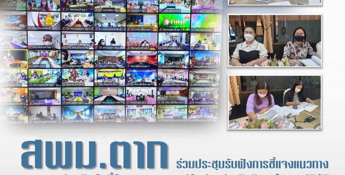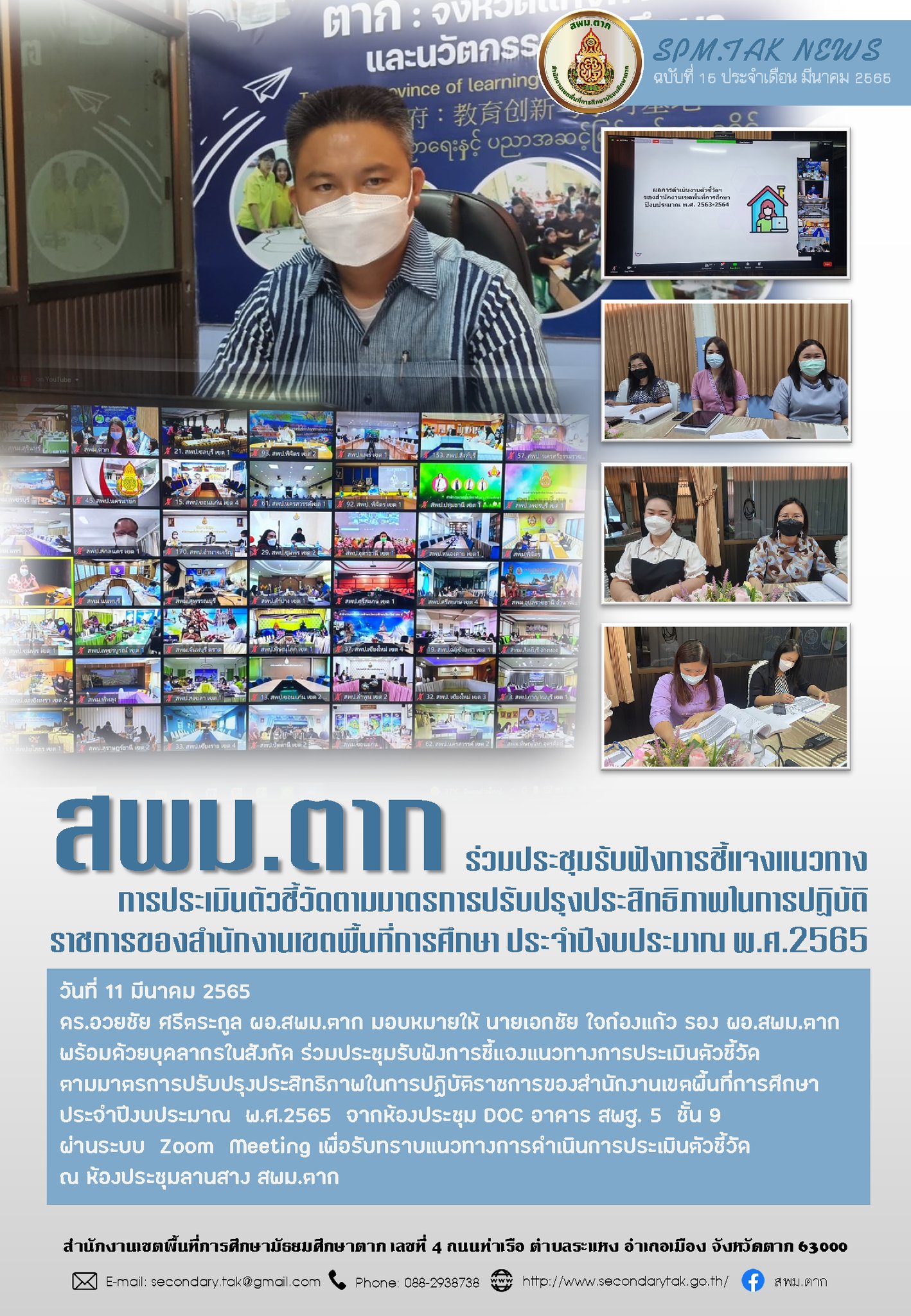วันที่ 11 มีนาคม 2565 ดร.อวยชัย ศรีตระกูล ผอ.สพม.ตาก มอบหมายให้ นายเอกชัย ใจก๋องแก้ว รอง ผอ.สพม.ตาก พร้อมด้วยบุคลากรในสังกัด ร่วมประชุมรับฟังการชี้แจงแนวทางการประเมินตัวชี้วัดตามมาตรการปรับปรุงประสิทธิภาพในการปฏิบัติราชการของสำนักงานเขตพื้นที่การศึกษา ประจำปีงบประมาณ พ.ศ.2565 จากห้องประชุม DOC อาคาร สพฐ. 5 ชั้น 9 ผ่านระบบ Zoom Meeting เพื่อรับทราบแนวทางการดำเนินการประเมินตัวชี้วัด ณ ห้องประชุมลานสาง สพม.ตาก