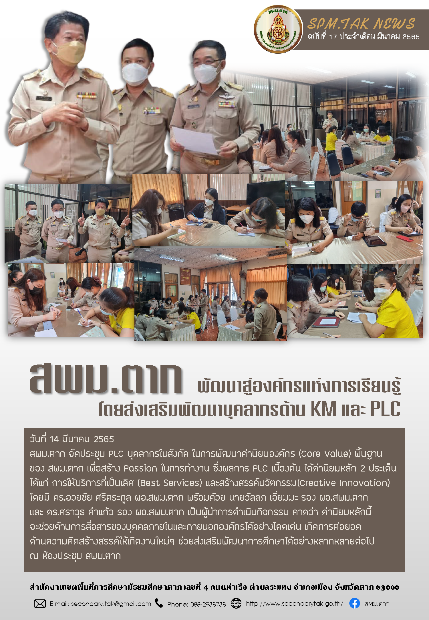 วันที่ 14 มีนาคม 2565 สพม.ตาก จัดประชุม PLC บุคลากรในสังกัด ในการพัฒนาค่านิยมองค์กร (Core Value) พื้นฐานของ สพม.ตาก เพื่อสร้าง Passion ในการทำงาน ซึ่งผลการ PLC เบื้องต้น ได้ค่านิยมหลัก 2 ประเด็น ได้แก่ การให้บริการที่เป็นเลิศ (Best Services) และสร้างสรรค์นวัตกรรม(Creative Innovation) โดยมี ดร.อวยชัย ศรีตระกูล ผอ.สพม.ตาก พร้อมด้วย นายวัลลภ เอี่ยมมะ รอง ผอ.สพม.ตาก และ ดร.ศราวุธ คำแก้ว รอง ผอ.สพม.ตาก เป็นผู้นำการดำเนินกิจกรรม คาดว่า ค่านิยมหลักนี้จะช่วยด้านการสื่อสารของบุคคลภายในและภายนอกองค์กรได้อย่างโดดเด่น เกิดการต่อยอดด้านความคิดสร้างสรรค์ให้เกิดงานใหม่ๆ ช่วยส่งเสริมพัฒนาการศึกษาได้อย่างหลากหลายต่อไป ณ ห้องประชุม สพม.ตาก