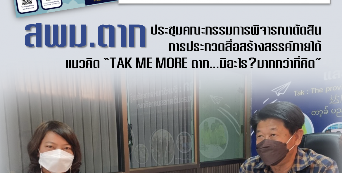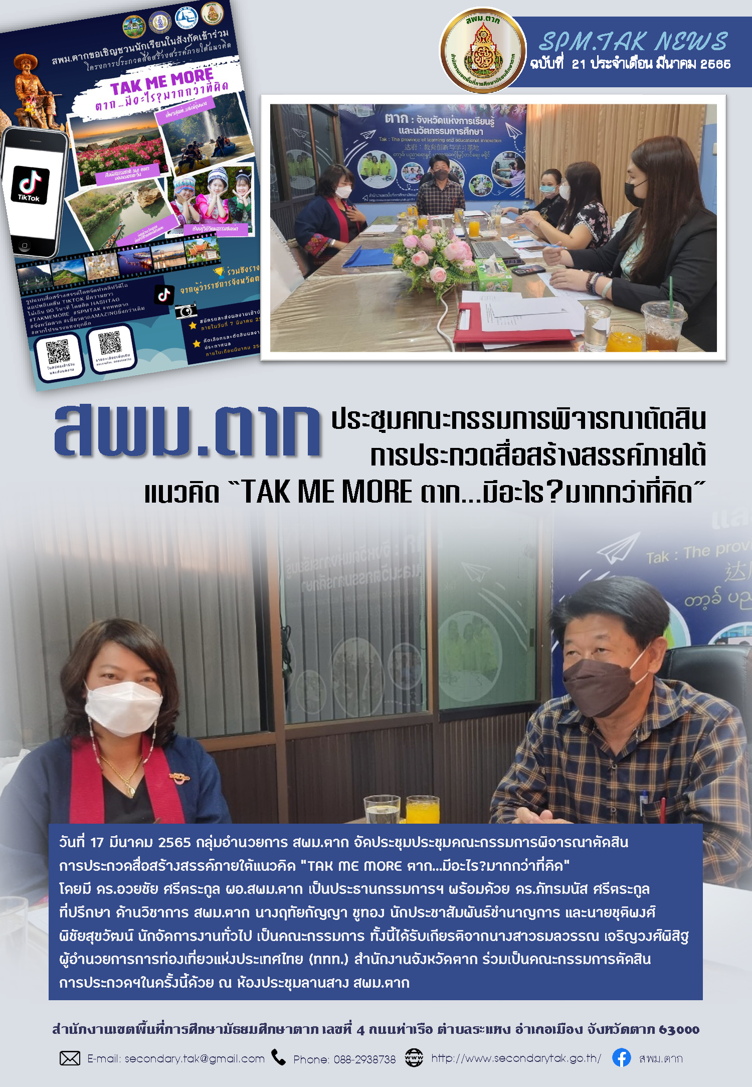 วันที่ 17 มีนาคม 2565 กลุ่มอำนวยการ สพม.ตาก จัดประชุมประชุมคณะกรรมการพิจารณาตัดสินการประกวดสื่อสร้างสรรค์ภายใต้แนวคิด “TAK ME MORE ตาก…มีอะไร?มากกว่าที่คิด”โดยมี ดร.อวยชัย ศรีตระกูล ผอ.สพม.ตาก เป็นประธานกรรมการฯ พร้อมด้วย ดร.ภัทรมนัส ศรีตระกูล ที่ปรึกษา ด้านวิชาการ สพม.ตาก นางฤทัยกัญญา ชูทอง นักประชาสัมพันธ์ชำนาญการ และนายชุติพงศ์ พิชัยสุขวัฒน์ นักจัดการงานทั่วไป เป็นคณะกรรมการ ทั้งนี้ได้รับเกียรติจากนางสาวธมลวรรณ เจริญวงศ์พิสิฐ ผู้อำนวยการการท่องเที่ยวแห่งประเทศไทย (ททท.) สำนักงานจังหวัดตาก ร่วมเป็นคณะกรรมการตัดสินการประกวดฯในครั้งนี้ด้วย ณ ห้องประชุมลานสาง สพม.ตาก