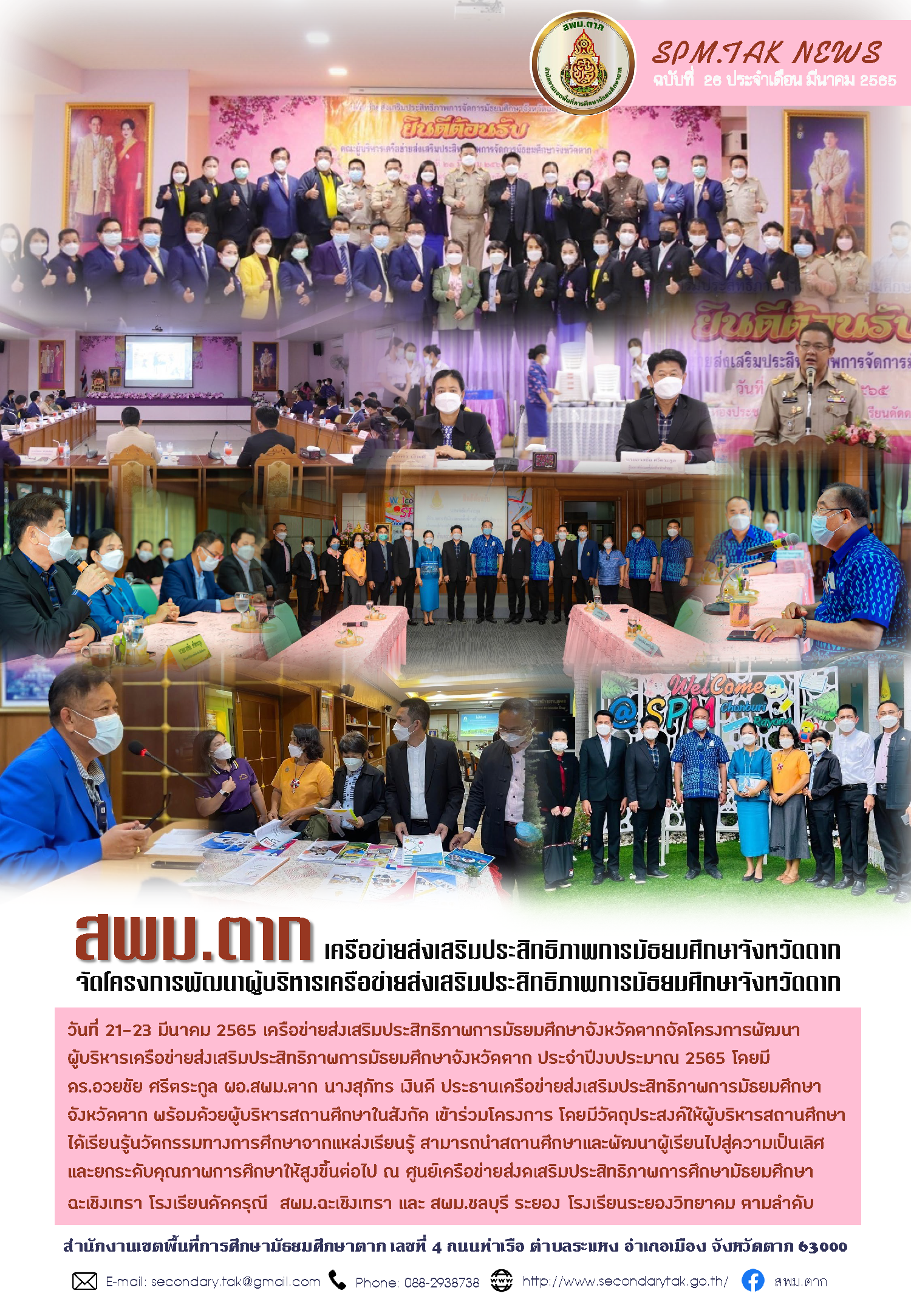 วันที่ 21-23 มีนาคม 2565 เครือข่ายส่งเสริมประสิทธิภาพการมัธยมศึกษาจังหวัดตากจัดโครงการพัฒนาผู้บริหารเครือข่ายส่งเสริมประสิทธิภาพการมัธยมศึกษาจังหวัดตาก ประจำปีงบประมาณ 2565 โดยมี ดร.อวยชัย ศรีตระกูล ผอ.สพม.ตาก นางสุภัทร เงินดี ประธานเครือข่ายส่งเสริมประสิทธิภาพการมัธยมศึกษาจังหวัดตาก พร้อมด้วยผู้บริหารสถานศึกษาในสังกัด เข้าร่วมโครงการ โดยมีวัตถุประสงค์ให้ผู้บริหารสถานศึกษาได้เรียนรู้นวัตกรรมทางการศึกษาจากแหล่งเรียนรู้ สามารถนำสถานศึกษาและพัฒนาผู้เรียนไปสู่ความเป็นเลิศและยกระดับคุณภาพการศึกษาให้สูงขึ้นต่อไป ณ ศูนย์เครือข่ายส่งดเสริมประสิทธิภาพการศึกษามัธยมศึกษาฉะเชิงเทรา โรงเรียนดัดดรุณี สพม.ฉะเชิงเทรา และ สพม.ชลบุรี ระยอง โรงเรียนระยองวิทยาคม ตามลำดับ