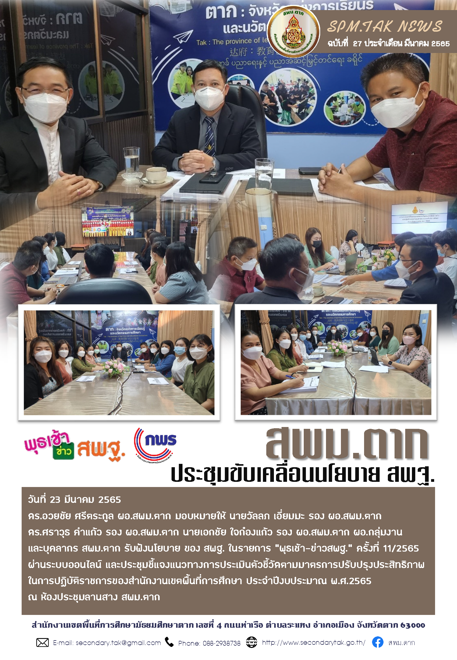 วันที่ 23 มีนาคม 2565 ดร.อวยชัย ศรีตระกูล ผอ.สพม.ตาก มอบหมายให้ นายวัลลภ เอี่ยมมะ รอง ผอ.สพม.ตาก ดร.ศราวุธ คำแก้ว รอง ผอ.สพม.ตาก นายเอกชัย ใจก๋องแก้ว รอง ผอ.สพม.ตาก ผอ.กลุ่มงาน และบุคลากร สพม.ตาก รับฟังนโยบาย ของ สพฐ. ในรายการ “พุธเช้า–ข่าวสพฐ.” ครั้งที่ 11/2565 ผ่านระบบออนไลน์ และประชุมชี้แจงแนวทางการประเมินตัวชี้วัดตามมาตรการปรับปรุงประสิทธิภาพในการปฏิบัติราชการของสำนักงานเขตพื้นที่การศึกษา ประจำปีงบประมาณ พ.ศ.2565