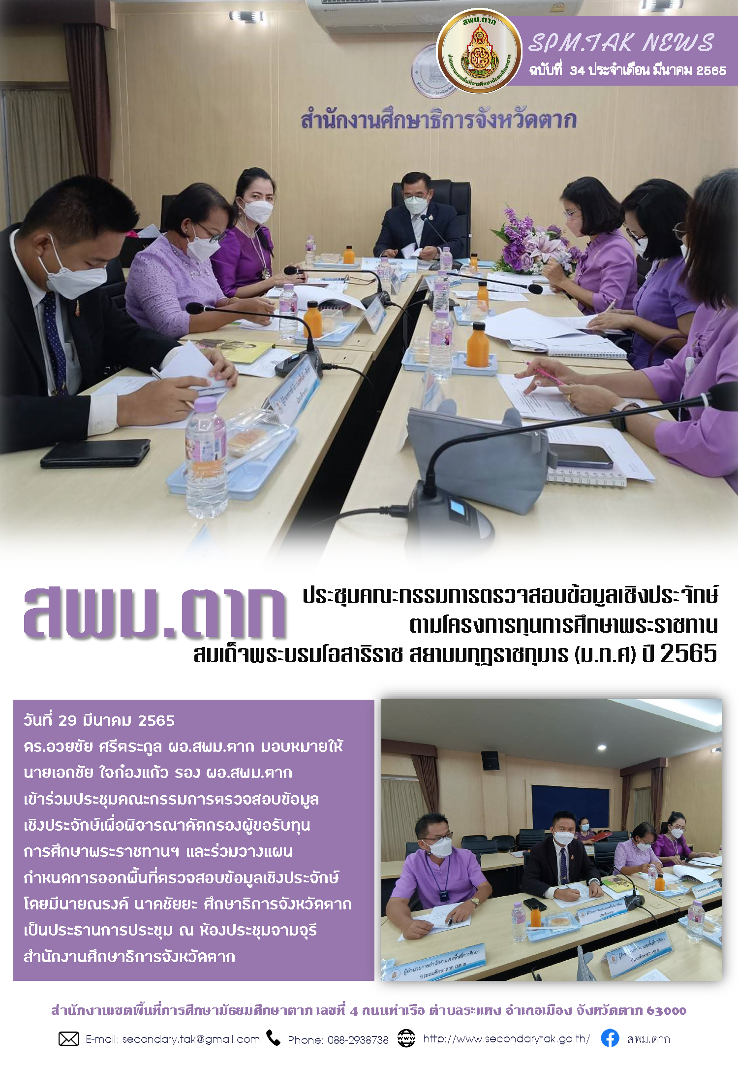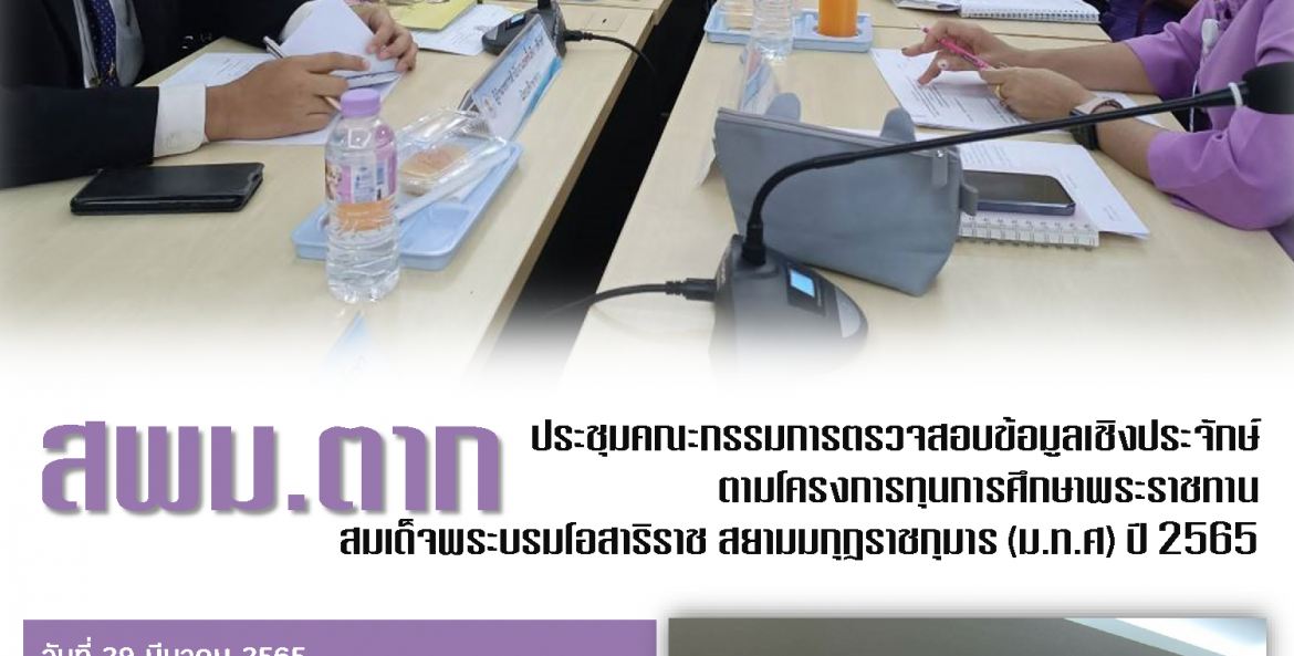 วันที่ 29 มีนาคม 2565 ดร.อวยชัย ศรีตระกูล ผอ.สพม.ตาก มอบหมายให้ นายเอกชัย ใจก๋องแก้ว รอง ผอ.สพม.ตาก เข้าร่วมประชุมคณะกรรมการตรวจสอบข้อมูลเชิงประจักษ์เพื่อพิจารณาคัดกรองผู้ขอรับทุน การศึกษาพระราชทานฯ และร่วมวางแผนกำหนดการออกพื้นที่ตรวจสอบข้อมูลเชิงประจักษ์ โดยมีนายณรงค์ นาคชัยยะ ศึกษาธิการจังหวัดตาก เป็นประธานการประชุม ณ ห้องประชุมจามจุรี สำนักงานศึกษาธิการจังหวัดตาก
