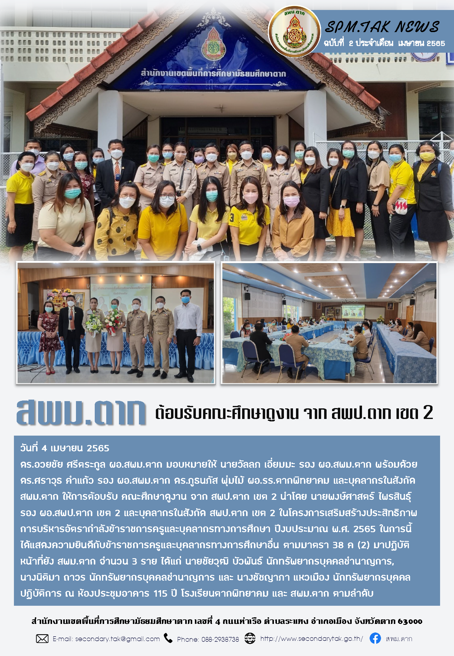 วันที่ 4 เมษายน 2565 ดร.อวยชัย ศรีตระกูล ผอ.สพม.ตาก มอบหมายให้ นายวัลลภ เอี่ยมมะ รอง ผอ.สพม.ตาก พร้อมด้วย ดร.ศราวุธ คำแก้ว รอง ผอ.สพม.ตาก ดร.ภูธนภัส พุ่มไม้ ผอ.รร.ตากพิทยาคม และบุคลากรในสังกัด สพม.ตาก ให้การต้อบรับ คณะศึกษาดูงาน จาก สพป.ตาก เขต 2 นำโดย นายพงษ์ศาสตร์ ไพรสินธุ์ รอง ผอ.สพป.ตาก เขต 2 และบุคลากรในสังกัด สพป.ตาก เขต 2 ในโครงการเสริมสร้างประสิทธิภาพการบริหารอัตรากำลังข้าราชการครูและบุคลากรทางการศึกษา ปีงบประมาณ พ.ศ. 2565 ในการนี้ ได้แสดงความยินดีกับข้าราชการครูและบุคลากรทางการศึกษาอื่น ตามมาตรา 38 ค (2) มาปฏิบัติหน้าที่ยัง สพม.ตาก จำนวน 3 ราย ได้แก่ นายชัยวุฒิ บัวพันธ์ นักทรัพยากรบุคคลชำนาญการ, นางนิติมา ถาวร นักทรัพยากรบุคคลชำนาญการ และ นางชัชญาภา แหวเมือง นักทรัพยากรบุคคลปฏิบัติการ