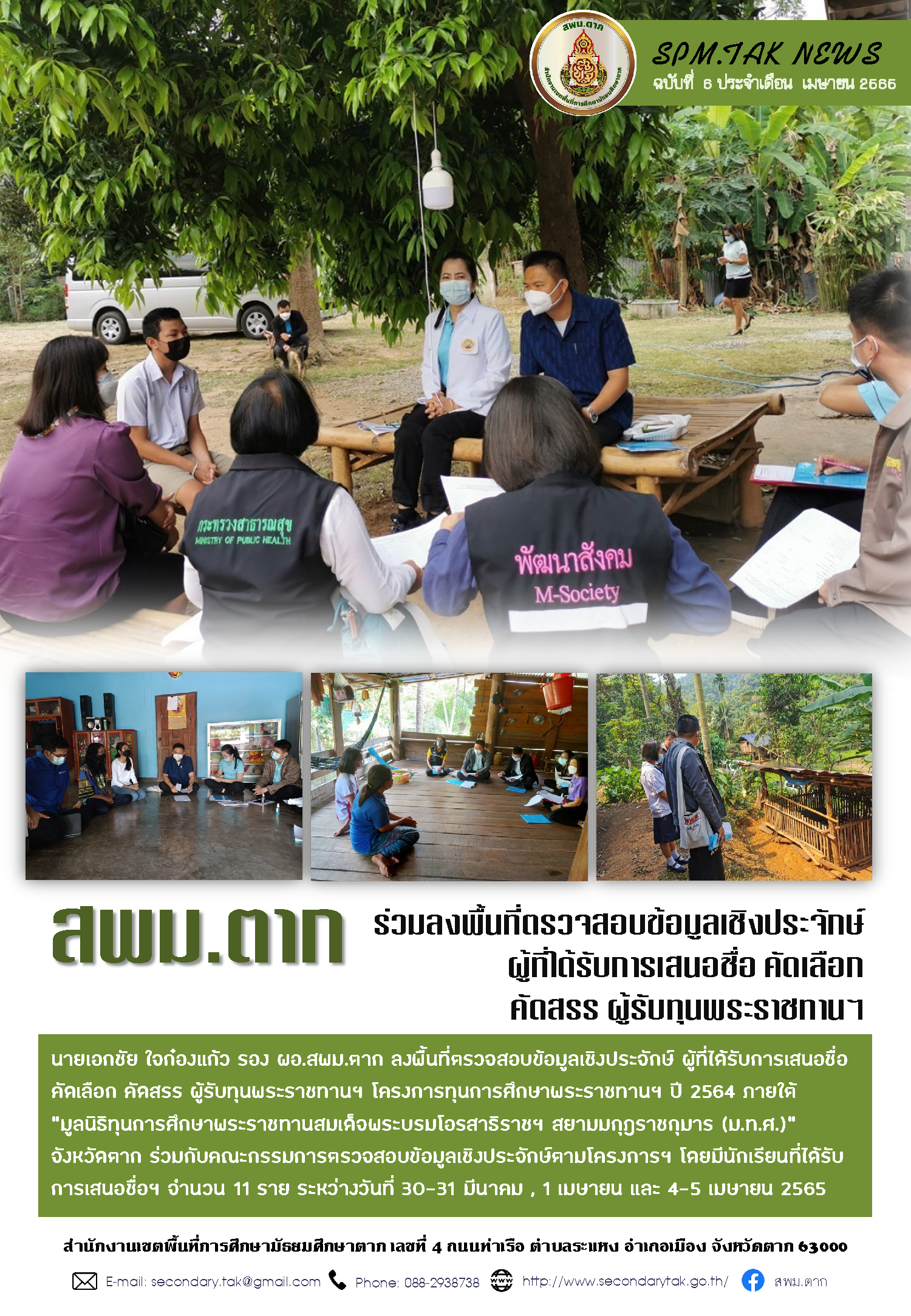 นายเอกชัย ใจก๋องแก้ว รอง ผอ.สพม.ตาก ลงพื้นที่ตรวจสอบข้อมูลเชิงประจักษ์ ผู้ที่ได้รับการเสนอชื่อ คัดเลือก คัดสรร ผู้รับทุนพระราชทานฯ โครงการทุนการศึกษาพระราชทานฯ ปี 2564 ภายใต้ “มูลนิธิทุนการศึกษาพระราชทานสมเด็จพระบรมโอรสาธิราชฯ สยามมกุฎราชกุมาร (ม.ท.ศ.)” จังหวัดตาก ร่วมกับคณะกรรมการตรวจสอบข้อมูลเชิงประจักษ์ตามโครงการฯ โดยมีนักเรียนที่ได้รับการเสนอชื่อฯ จำนวน 11 ราย ระหว่างวันที่ 30-31 มีนาคม , 1 เมษายน และ 4-5 เมษายน 2565