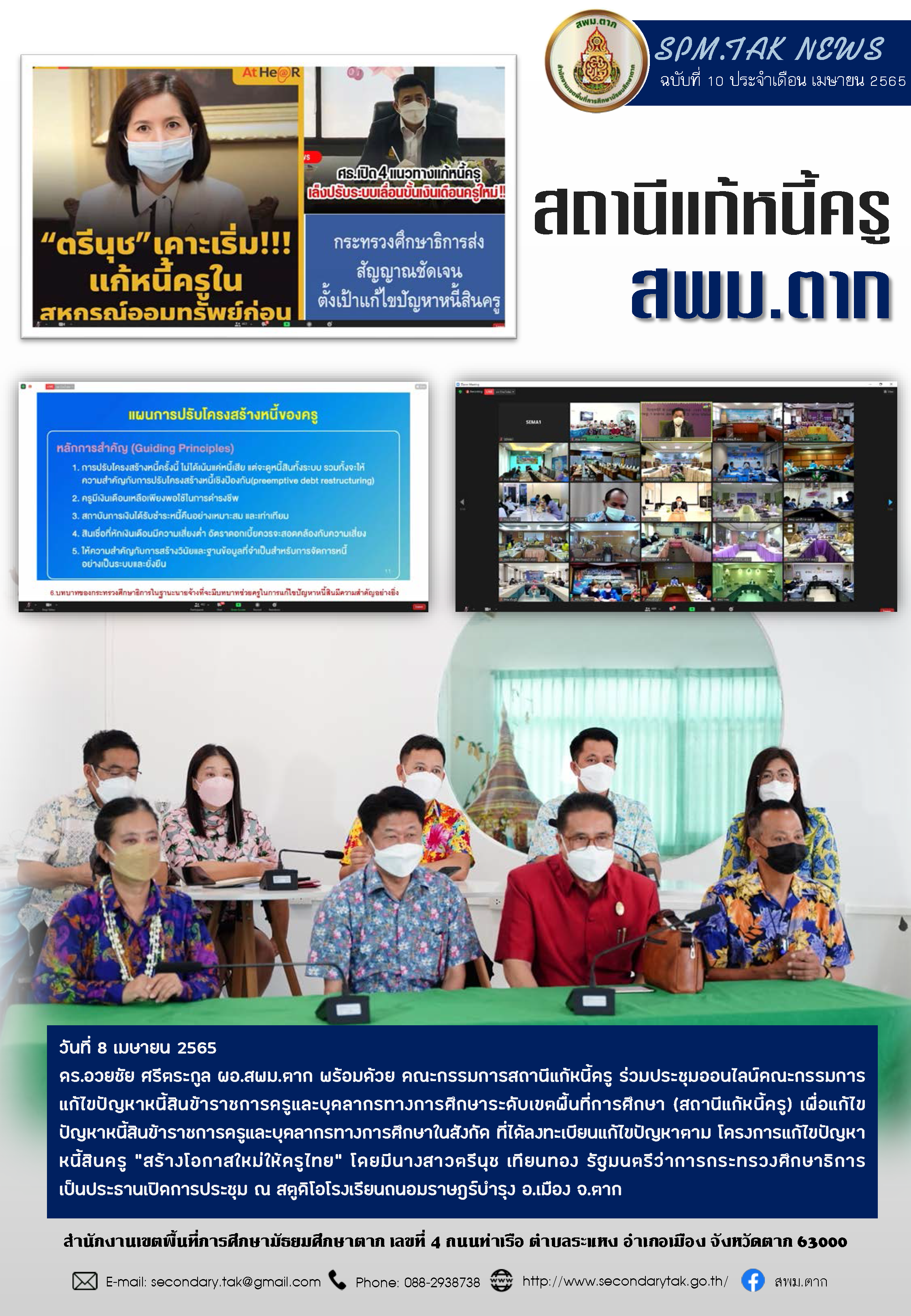 วันที่ 8 เมษายน 2565 ดร.อวยชัย ศรีตระกูล ผอ.สพม.ตาก พร้อมด้วย คณะกรรมการสถานีแก้หนี้ครู ร่วมประชุมออนไลน์คณะกรรมการแก้ไขปัญหาหนี้สินข้าราชการครูและบุคลากรทางการศึกษาระดับเขตพื้นที่การศึกษา (สถานีแก้หนี้ครู) เพื่อแก้ไขปัญหาหนี้สินข้าราชการครูและบุคลากรทางการศึกษาในสังกัด ที่ได้ลงทะเบียนแก้ไขปัญหาตาม โครงการแก้ไขปัญหาหนี้สินครู “สร้างโอกาสใหม่ให้ครูไทย” โดยมีนางสาวตรีนุช เทียนทอง รัฐมนตรีว่าการกระทรวงศึกษาธิการเป็นประธานเปิดการประชุม ณ สตูดิโอโรงเรียนถนอมราษฎร์บำรุง อ.เมือง จ.ตาก
