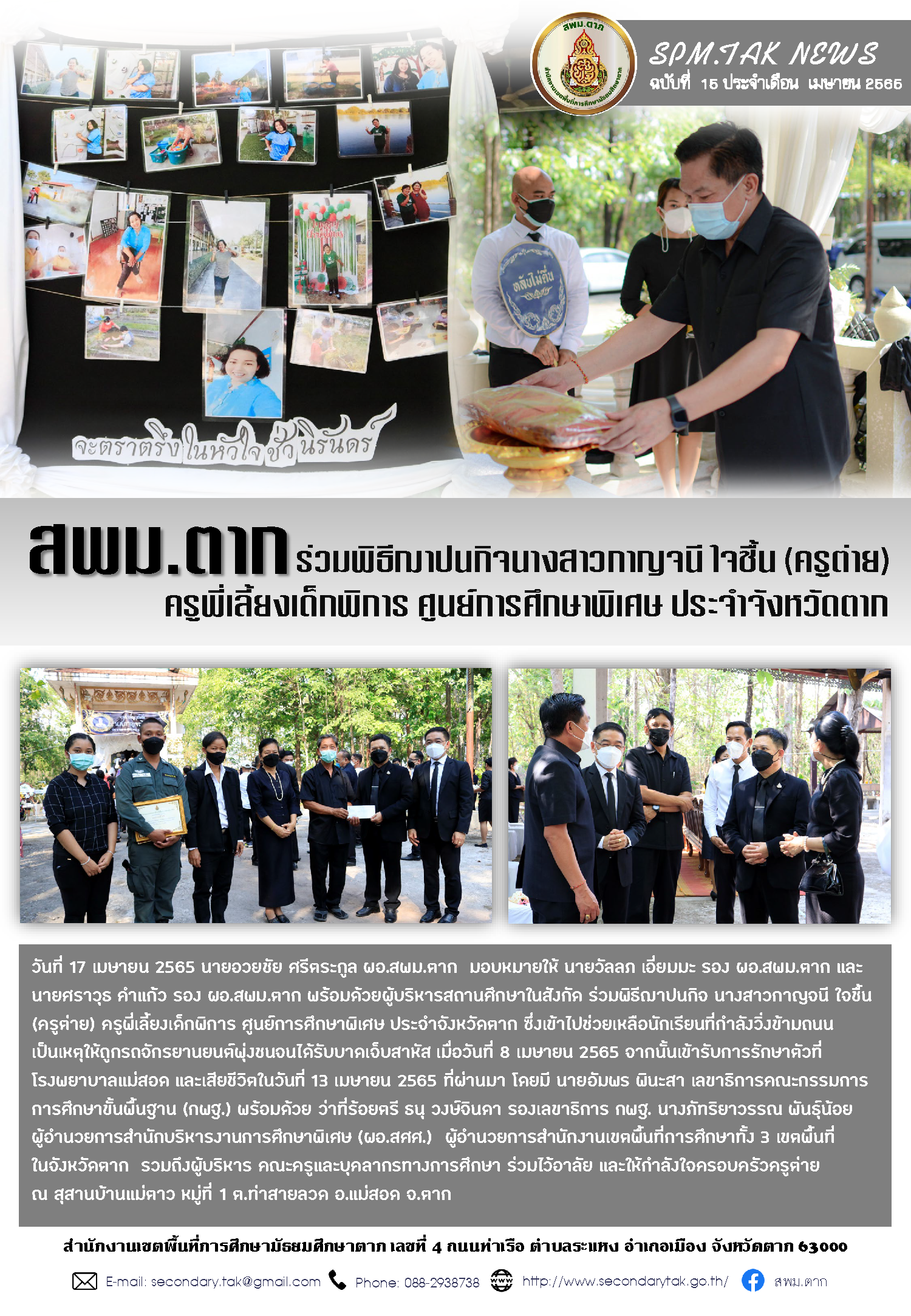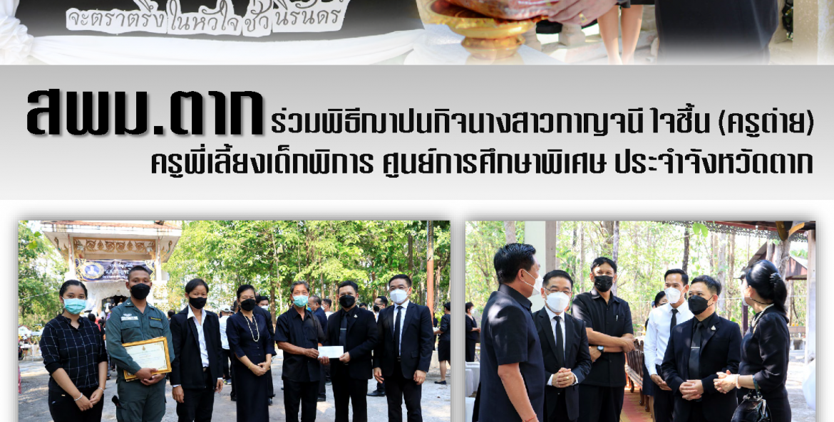 วันที่ 17 เมษายน 2565 นายอวยชัย ศรีตระกูล ผอ.สพม.ตาก มอบหมายให้ นายวัลลภ เอี่ยมมะ รอง ผอ.สพม.ตาก และนายศราวุธ คำแก้ว รอง ผอ.สพม.ตาก พร้อมด้วยผู้บริหารสถานศึกษาในสังกัด ร่วมพิธีฌาปนกิจ นางสาวกาญจนี ใจชื้น (ครูต่าย) ครูพี่เลี้ยงเด็กพิการ ศูนย์การศึกษาพิเศษ ประจำจังหวัดตาก ซึ่งเข้าไปช่วยเหลือนักเรียนที่กำลังวิ่งข้ามถนน เป็นเหตุให้ถูกรถจักรยานยนต์พุ่งชนจนได้รับบาดเจ็บสาหัส เมื่อวันที่ 8 เมษายน 2565 จากนั้นเข้ารับการรักษาตัวที่โรงพยาบาลแม่สอด และเสียชีวิตในวันที่ 13 เมษายน 2565 ที่ผ่านมา โดยมี นายอัมพร พินะสา เลขาธิการคณะกรรมการการศึกษาขั้นพื้นฐาน (กพฐ.) พร้อมด้วย ว่าที่ร้อยตรี ธนุ วงษ์จินดา รองเลขาธิการ กพฐ. นางภัทริยาวรรณ พันธุ์น้อย ผู้อำนวยการสำนักบริหารงานการศึกษาพิเศษ (ผอ.สศศ.) ผู้อำนวยการสำนักงานเขตพื้นที่การศึกษาทั้ง 3 เขตพื้นที่ในจังหวัดตาก รวมถึงผู้บริหาร คณะครูและบุคลากรทางการศึกษา ร่วมไว้อาลัย และให้กำลังใจครอบครัวครูต่าย ณ สุสานบ้านแม่ตาว หมู่ที่ 1 ต.ท่าสายลวด อ.แม่สอด จ.ตาก