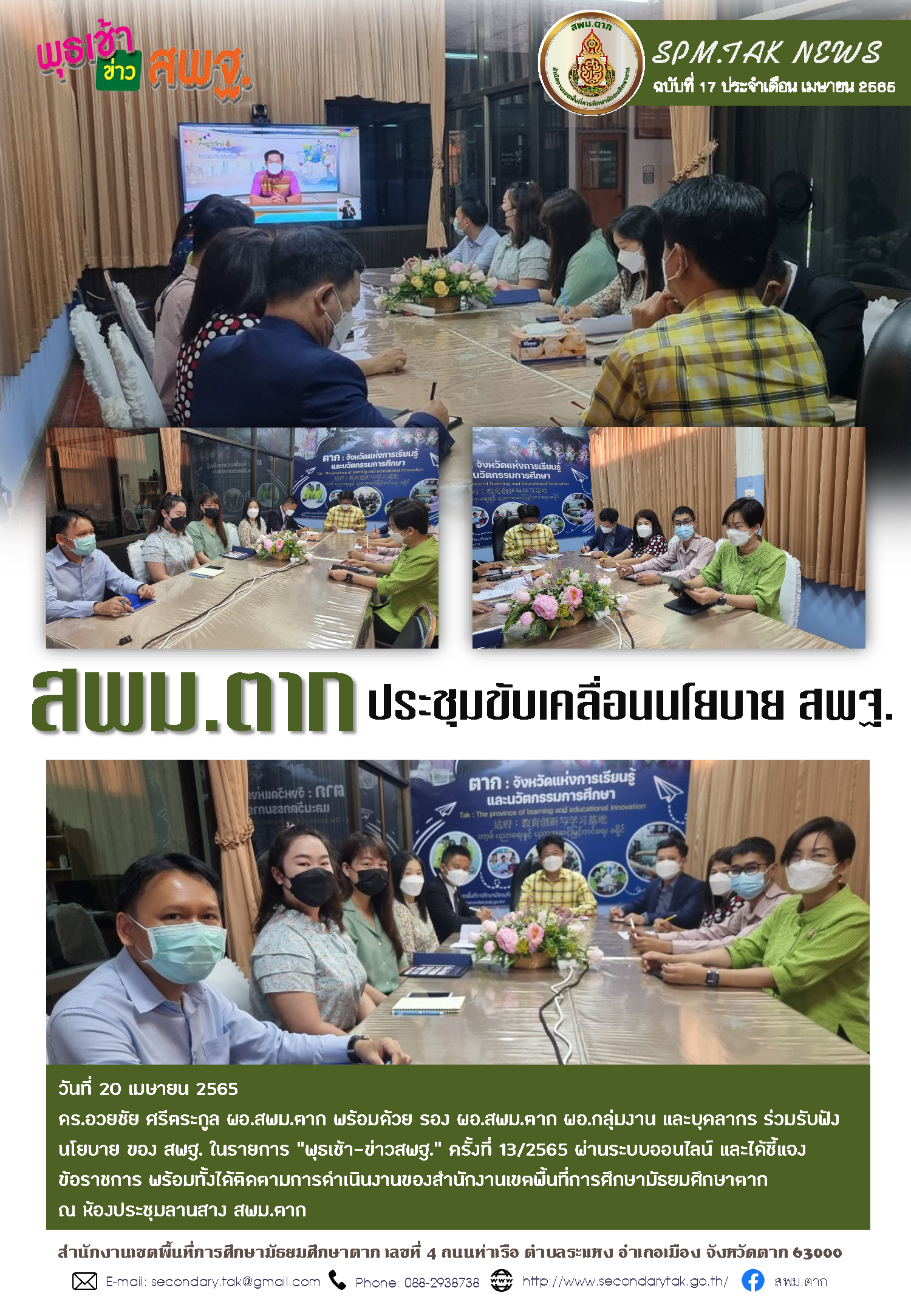 วันที่ 20 เมษายน 2565 ดร.อวยชัย ศรีตระกูล ผอ.สพม.ตาก พร้อมด้วย รอง ผอ.สพม.ตาก ผอ.กลุ่มงาน และบุคลากร ร่วมรับฟังนโยบาย ของ สพฐ. ในรายการ “พุธเช้า–ข่าวสพฐ.” ครั้งที่ 13/2565 ผ่านระบบออนไลน์ และได้ชี้แจง ข้อราชการ พร้อมทั้งได้ติดตามการดำเนินงานของสำนักงานเขตพื้นที่การศึกษามัธยมศึกษาตาก