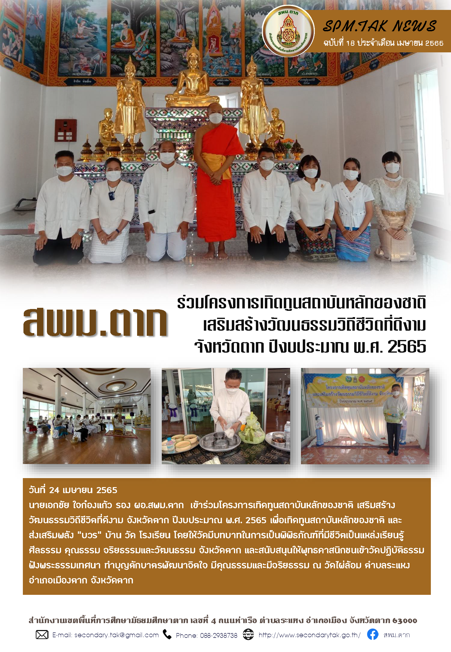 วันที่ 24 เมษายน 2565 นายเอกชัย ใจก๋องแก้ว รอง ผอ.สพม.ตาก เข้าร่วมโครงการเทิดทูนสถาบันหลักของชาติ เสริมสร้างวัฒนธรรมวิถีชีวิตที่ดีงาม จังหวัดตาก ปีงบประมาณ พ.ศ. 2565 เพื่อเทิดทูนสถาบันหลักของชาติ และส่งเสริมพลัง “บวร“ บ้าน วัด โรงเรียน โดยให้วัดมีบทบาทในการเป็นพิพิธภัณฑ์ที่มีชีวิตเป็นแหล่งเรียนรู้ศีลธรรม คุณธรรม จริยธรรมและวัฒนธรรม จังหวัดตาก และสนับสนุนให้พุทธคาสนิกชนเข้าวัดปฏิบัติธรรม ฟังพระธรรมเทศนา ทำบุญตักบาตรพัฒนาจิตใจ มีคุณธรรมและมีจริยธรรม ณ วัดไผ่ล้อม ตำบลระแหง อำเภอเมืองตาก จังหวัดตาก