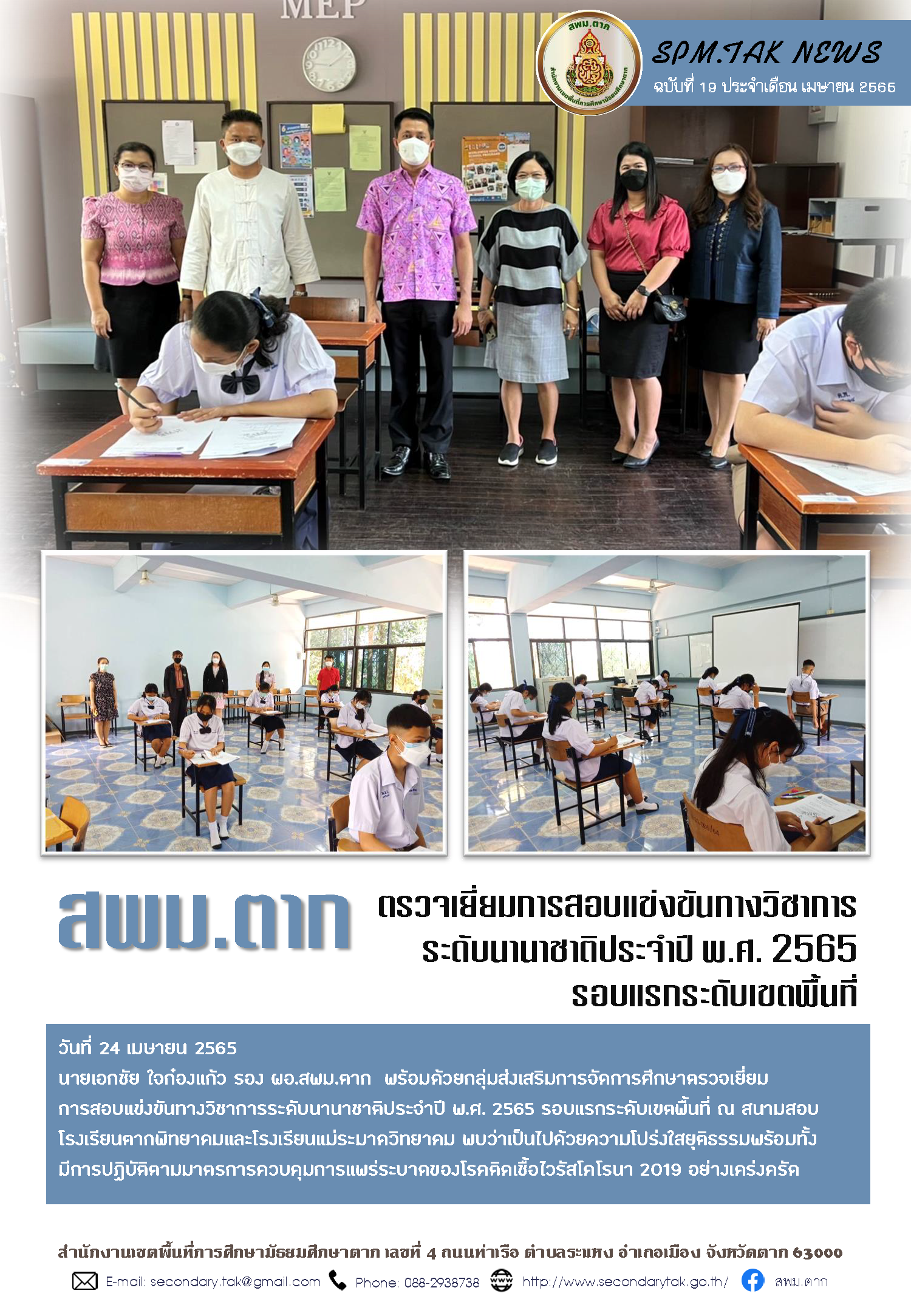 วันที่ 24 เมษายน 2565 นายเอกชัย ใจก๋องแก้ว รอง ผอ.สพม.ตาก พร้อมด้วยกลุ่มส่งเสริมการจัดการศึกษาตรวจเยี่ยมการสอบแข่งขันทางวิชาการระดับนานาชาติประจำปี พ.ศ. 2565 รอบแรกระดับเขตพื้นที่ ณ สนามสอบโรงเรียนตากพิทยาคมและโรงเรียนแม่ระมาดวิทยาคม พบว่าเป็นไปด้วยความโปร่งใสยุติธรรมพร้อมทั้งมีการปฏิบัติตามมาตรการควบคุมการแพร่ระบาดของโรคติดเชื้อไวรัสโคโรนา 2019 อย่างเคร่งครัด