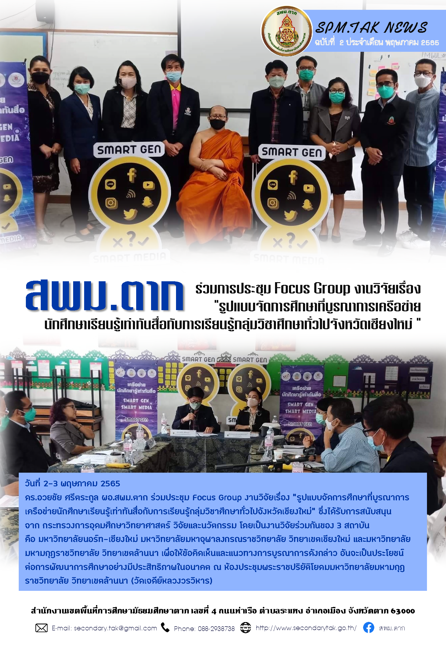 วันที่ 2-3 พฤษภาคม 2565 ดร.อวยชัย ศรีตระกูล ผอ.สพม.ตาก ร่วมประชุม Focus Group งานวิจัยเรื่อง “รูปแบบจัดการศึกษาที่บูรณาการเครือข่ายนักศึกษาเรียนรู้เท่าทันสื่อกับการเรียนรู้กลุ่มวิชาศึกษาทั่วไปจังหวัดเชียงใหม่” ซึ่งได้รับการสนับสนุน จาก กระทรวงการอุดมศึกษาวิทยาศาสตร์ วิจัยและนวัตกรรม โดยเป็นงานวิจัยร่วมกันของ 3 สถาบัน คือ มหาวิทยาลัยนอร์ท-เซียงใหม่ มหาวิทยาลัยมหาจุฬาลงกรณราชวิทยาลัย วิทยาเขตเชียงใหม่ และมหาวิทยาลัยมหามกุฎราชวิทยาลัย วิทยาเขตล้านนา เพื่อให้ข้อคิดเห็นและแนวทางการบูรณาการดังกล่าว อันจะเป็นประโยชน์ ต่อการพัฒนาการศึกษาอย่างมีประสิทธิภาพในอนาคต ณ ห้องประชุมพระราชปริยัติโยดมมหาวิทยาลัยมหามกุฎราชวิทยาลัย วิทยาเขตล้านนา (วัดเจดีย์หลวงวรวิหาร)