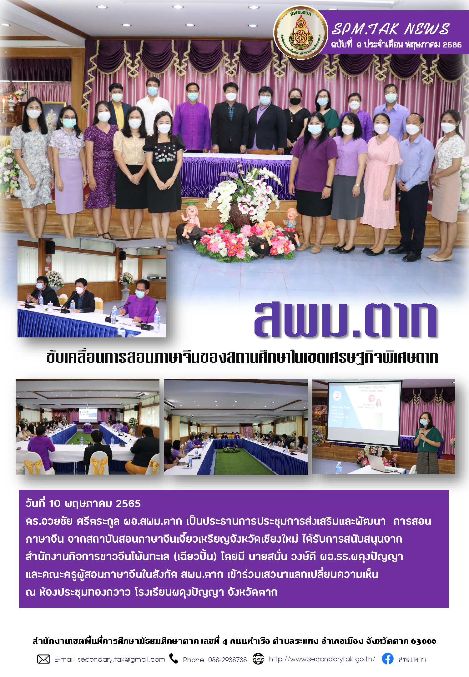 วันที่ 10 พฤษภาคม 2565 ดร.อวยชัย ศรีตระกูล ผอ.สพม.ตาก เป็นประธานการประชุมการส่งเสริมและพัฒนา การสอนภาษาจีน จากสถาบันสอนภาษาจีนเจี้ยวเหรียญจังหวัดเชียงใหม่ ได้รับการสนับสนุนจาก สำนักงานกิจการชาวจีนโพ้นทะเล (เฉียวปั้น) โดยมี นายสนั่น วงษ์ดี ผอ.รร.ผดุงปัญญา และคณะครูผู้สอนภาษาจีนในสังกัด สพม.ตาก เข้าร่วมเสวนาแลกเปลี่ยนความเห็น ณ ห้องประชุมทองกวาว โรงเรียนผดุงปัญญา จังหวัดตาก