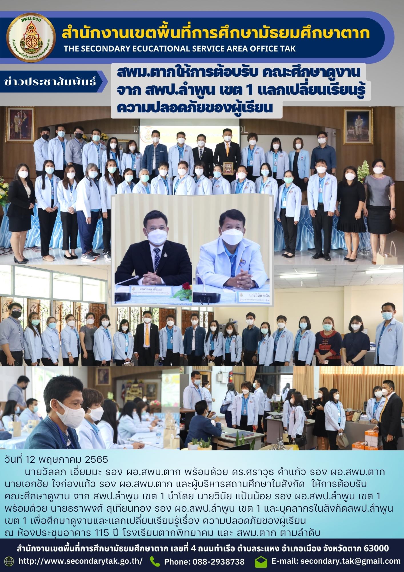 วันที่ 12 พฤษภาคม 2565 นายวัลลภ เอี่ยมมะ รอง ผอ.สพม.ตาก พร้อมด้วย ดร.ศราวุธ คำแก้ว รอง ผอ.สพม.ตาก นายเอกชัย ใจก่องแก้ว รอง ผอ.สพม.ตาก และผู้บริหารสถานศึกษาในสังกัด ให้การต้อบรับ คณะศึกษาดูงาน จาก สพป.ลำพูน เขต 1 นำโดย นายวินัย แป้นน้อย รอง ผอ.สพป.ลำพูน เขต 1 พร้อมด้วย นายธราพงศ์ สุเทียนทอง รอง ผอ.สพป.ลำพูน เขต 1 และบุคลากรในสังกัดสพป.ลำพูน เขต 1 เพื่อศึกษาดูงานและแลกเปลี่ยนเรียนรู้เรื่อง ความปลอดภัยของผู้เรียน ณ ห้องประชุมอาคาร 115 ปี โรงเรียนตากพิทยาคม และ สพม.ตาก ตามลำดับ