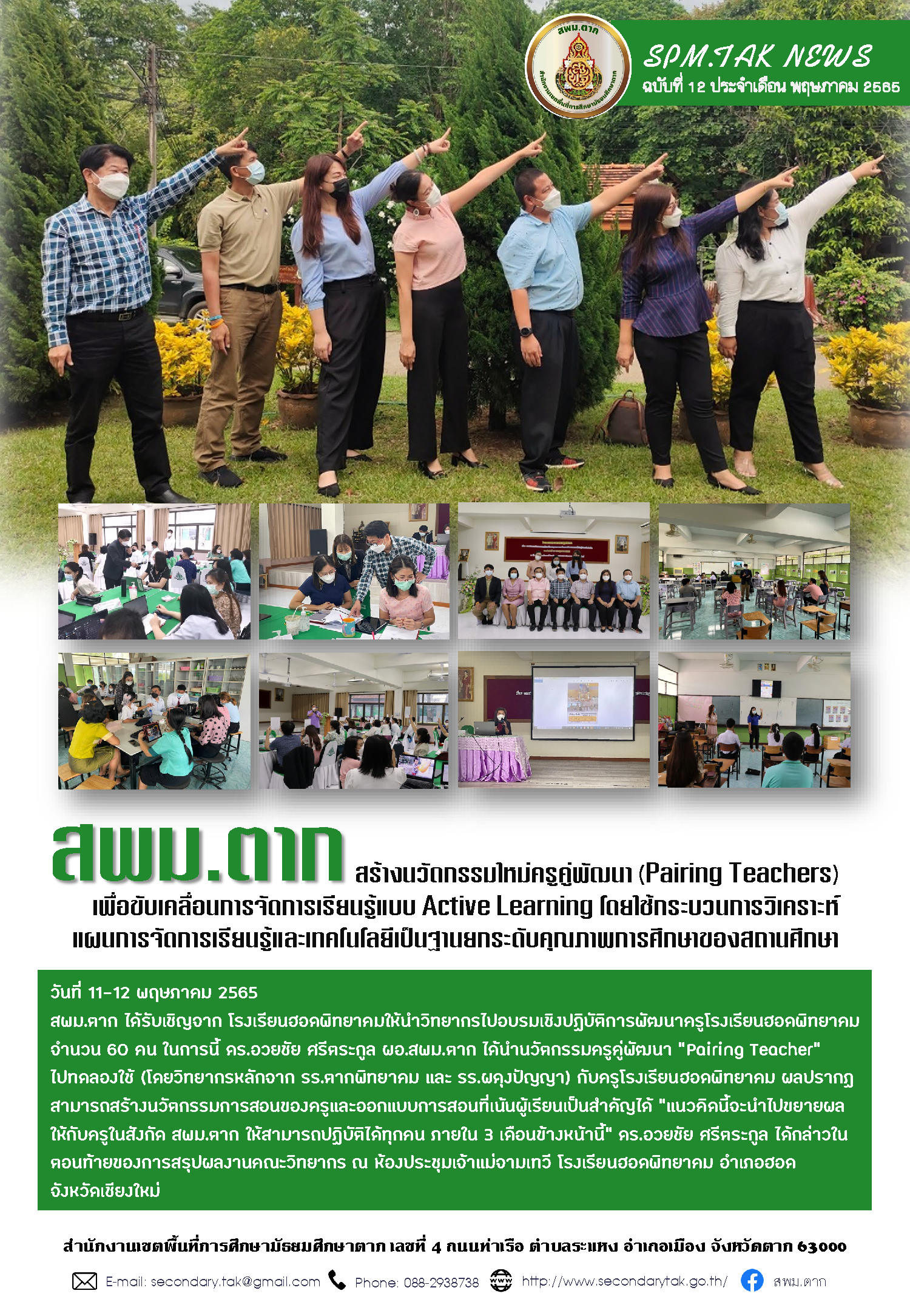 สพม.ตาก ได้รับเชิญจาก โรงเรียนฮอดพิทยาคมให้นำวิทยากรไปอบรมเชิงปฏิบัติการพัฒนาครูโรงเรียนฮอดพิทยาคม จำนวน 60 คน ในการนี้ ดร.อวยชัย ศรีตระกูล ผอ.สพม.ตาก ได้นำนวัตกรรมครูคู่พัฒนา “Pairing Teacher” ไปทดลองใช้ (โดยวิทยากรหลักจาก รร.ตากพิทยาคม และ รร.ผดุงปัญญา) กับครูโรงเรียนฮอดพิทยาคม ผลปรากฏสามารถสร้างนวัตกรรมการสอนของครูและออกแบบการสอนที่เน้นผู้เรียนเป็นสำคัญได้ “แนวคิดนี้จะนำไปขยายผลให้กับครูในสังกัด สพม.ตาก ให้สามารถปฏิบัติได้ทุกคน ภายใน 3 เดือนข้างหน้านี้” ดร.อวยชัย ศรีตระกูล ได้กล่าวในตอนท้ายของการสรุปผลงานคณะวิทยากร ณ ห้องประชุมเจ้าแม่จามเทวี โรงเรียนฮอดพิทยาคม อำเภอฮอด จังหวัดเชียงใหม่