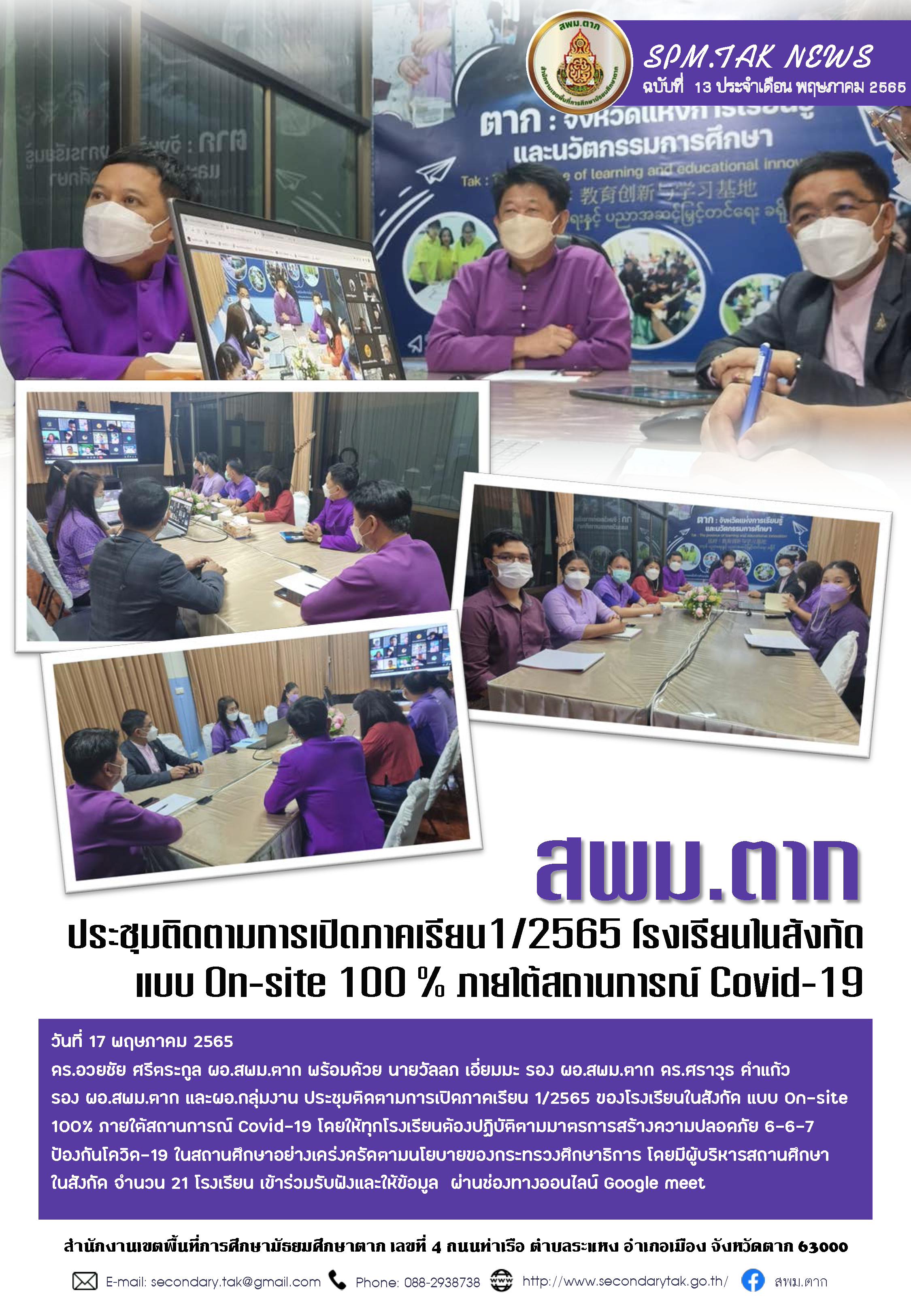 วันที่ 17 พฤษภาคม 2565 ดร.อวยชัย ศรีตระกูล ผอ.สพม.ตาก พร้อมด้วย นายวัลลภ เอี่ยมมะ รอง ผอ.สพม.ตาก ดร.ศราวุธ คำแก้ว รอง ผอ.สพม.ตาก และผอ.กลุ่มงาน ประชุมติดตามการเปิดภาคเรียน 1/2565 ของโรงเรียนในสังกัด แบบ On-site 100% ภายใต้สถานการณ์ Covid-19 โดยให้ทุกโรงเรียนต้องปฏิบัติตามมาตรการสร้างความปลอดภัย 6-6-7 ป้องกันโควิด-19 ในสถานศึกษาอย่างเคร่งครัดตามนโยบายของกระทรวงศึกษาธิการ โดยมีผู้บริหารสถานศึกษาในสังกัด จำนวน 21 โรงเรียน เข้าร่วมรับฟังและให้ข้อมูล ผ่านช่องทางออนไลน์ Google meet