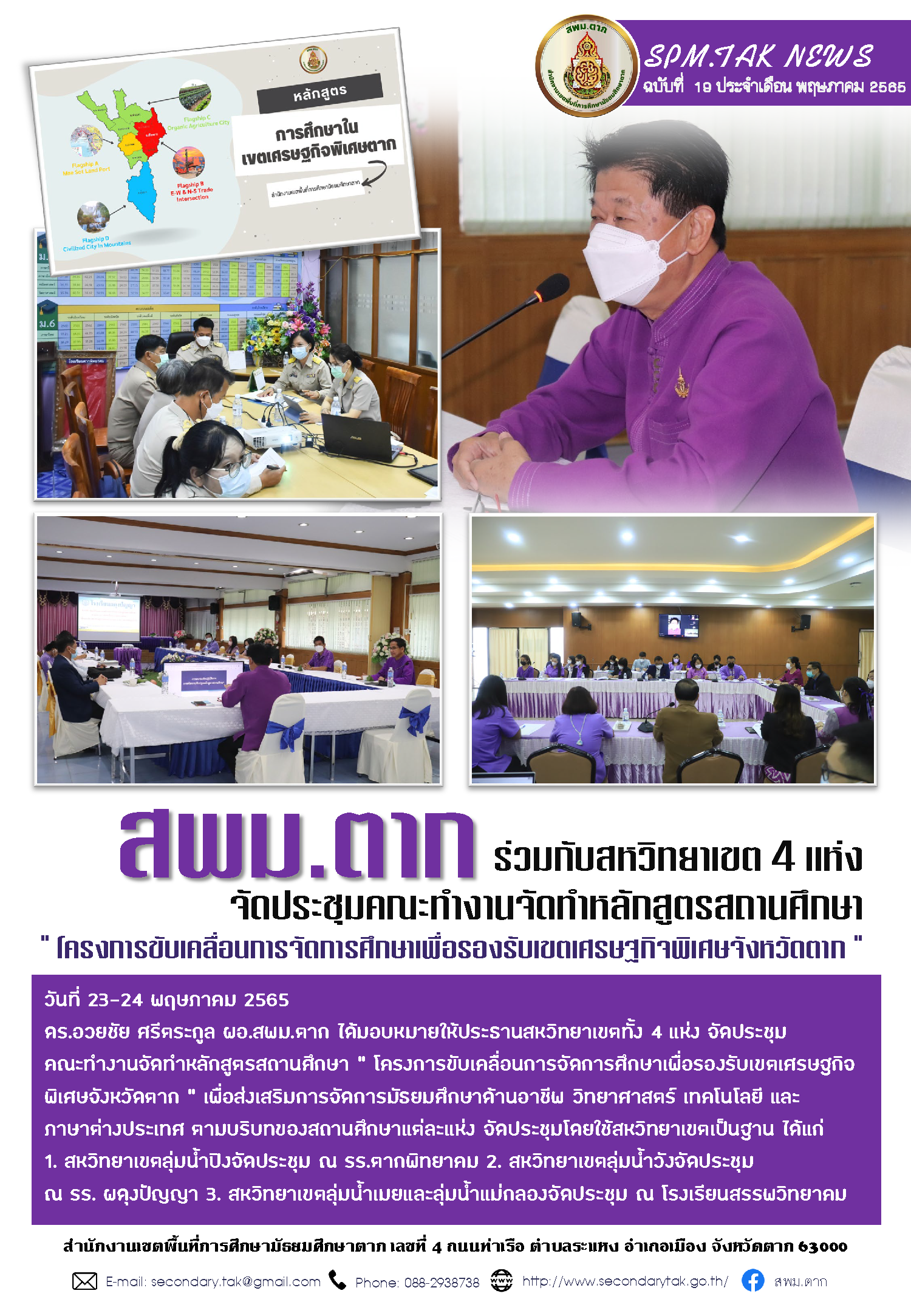 วันที่ 23-24 พฤษภาคม 2565 ดร.อวยชัย ศรีตระกูล ผอ.สพม.ตาก ได้มอบหมายให้ประธานสหวิทยาเขตทั้ง 4 แห่ง จัดประชุมคณะทำงานจัดทำหลักสูตรสถานศึกษา ” โครงการขับเคลื่อนการจัดการศึกษาเพื่อรองรับเขตเศรษฐกิจพิเศษจังหวัดตาก “ เพื่อส่งเสริมการจัดการมัธยมศึกษาด้านอาชีพ วิทยาศาสตร์ เทคโนโลยี และภาษาต่างประเทศ ตามบริบทของสถานศึกษาแต่ละแห่ง จัดประชุมโดยใช้สหวิทยาเขตเป็นฐาน ได้แก่ 1. สหวิทยาเขตลุ่มน้ำปิงจัดประชุม ณ รร.ตากพิทยาคม 2. สหวิทยาเขตลุ่มน้ำวังจัดประชุม ณ รร. ผดุงปัญญา 3. สหวิทยาเขตลุ่มน้ำเมยและลุ่มน้ำแม่กลองจัดประชุม ณ โรงเรียนสรรพวิทยาคม