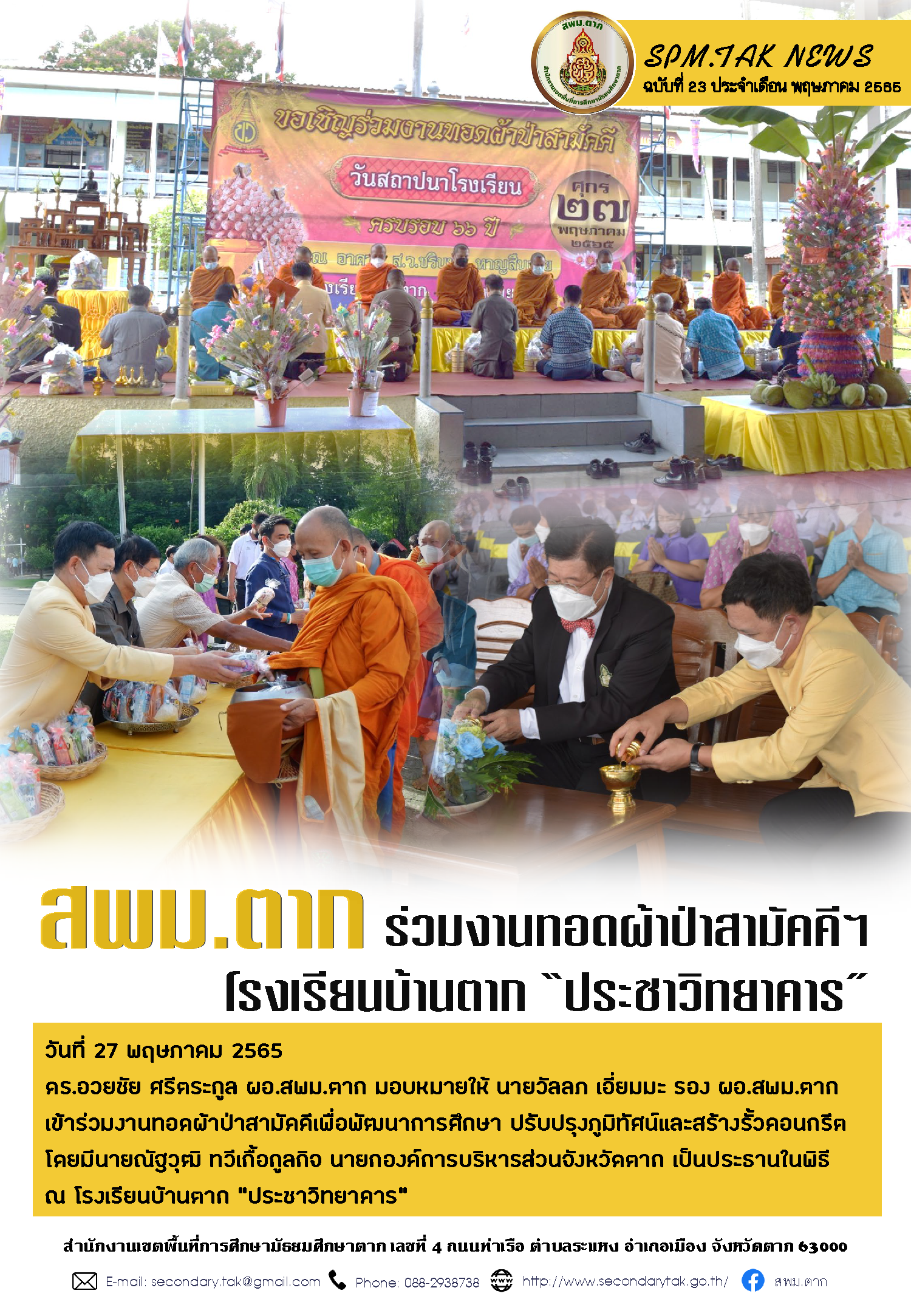 วันที่ 27 พฤษภาคม 2565 ดร.อวยชัย ศรีตระกูล ผอ.สพม.ตาก มอบหมายให้ นายวัลลภ เอี่ยมมะ รอง ผอ.สพม.ตาก เข้าร่วมงานทอดผ้าป่าสามัคคีเพื่อพัฒนาการศึกษา ปรับปรุงภูมิทัศน์และสร้างรั้วคอนกรีต โดยมีนายณัฐวุฒิ ทวีเกื้อกูลกิจ นายกองค์การบริหารส่วนจังหวัดตาก เป็นประธานในพิธี ณ โรงเรียนบ้านตาก “ประชาวิทยาคาร”