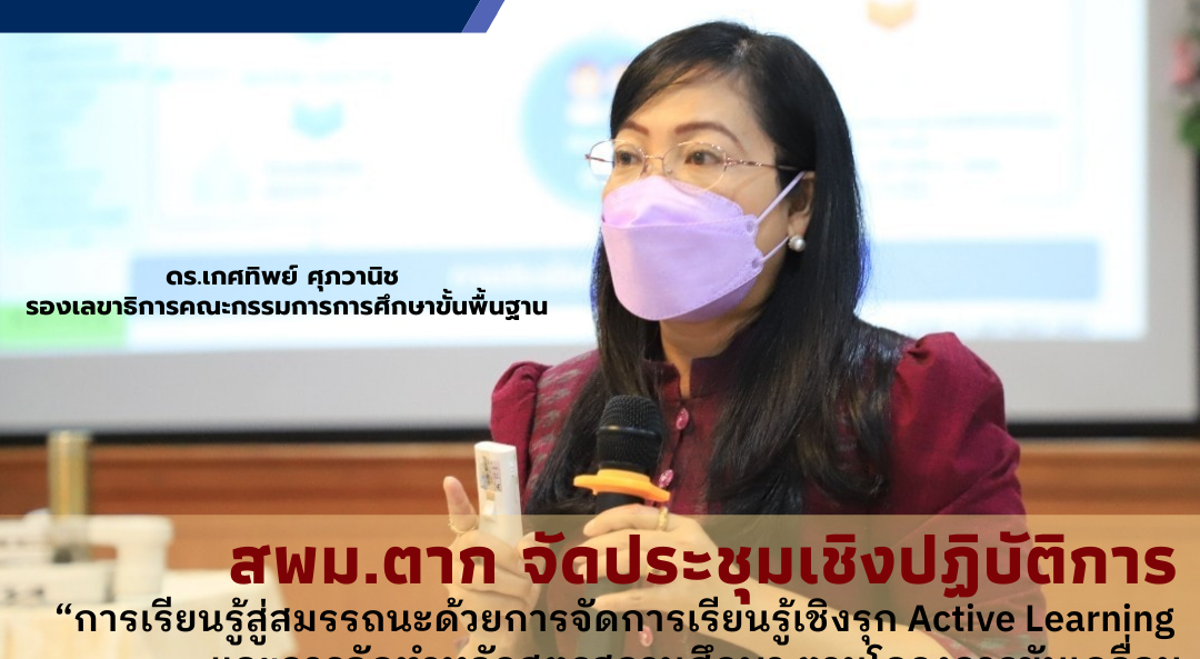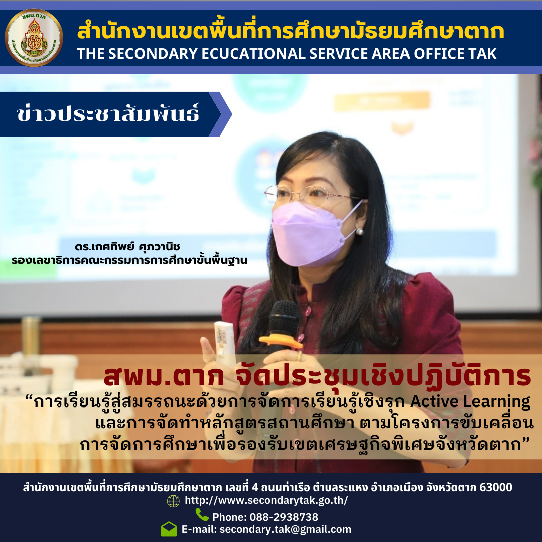 วันที่ 30-31 พฤษภาคม 2565 สำนักงานเขตพื้นที่การศึกษามัธยมศึกษาตาก ร่วมกับเครือข่ายส่งเสริมประสิทธิภาพมัธยมศึกษาจังหวัดตาก จัดประชุมเชิงปฏิบัติการ “การเรียนรู้สู่สมรรถนะด้วยการจัดการเรียนรู้เชิงรุก Active Learning และการจัดทำหลักสูตรสถานศึกษา ตามโครงการขับเคลื่อนการจัดการศึกษาเพื่อรองรับเขตเศรษฐกิจพิเศษจังหวัดตาก” เพื่อให้สอดคล้องกับการขยายตัวทางเศรษฐกิจ และความเปลี่ยนแปลงของสังคม รวมถึงการสร้างโอกาส ด้านการสร้างความสามารถในการแข่งขัน และมีความมุ่งมั่นพัฒนาการศึกษาสู่สากล พัฒนากำลังคนในพื้นที่เขตเศรษฐกิจพิเศษ ให้มีคุณภาพชีวิตที่ดี มีทักษะการทำงานที่หลากหลาย โดยมี ดร.อวยชัย ศรีตระกูล ผอ.สพม.ตาก เป็นประธานเปิดการประชุมฯ และบรรยายพิเศษ ทั้งนี้ ได้รับเกียรติจาก ดร.เกศทิพย์ ศุภวานิช รองเลขาธิการคณะกรรมการการศึกษาขั้นพื้นฐาน ร่วมชมนิทรรศการทางวิชาการ และบรรยายพิเศษ ณ ห้องประชุมใหญ่ อาคารเฉลิมพระเกียรติ โรงเรียนสรรพวิทยาคม อ.แม่สอด จ.ตาก