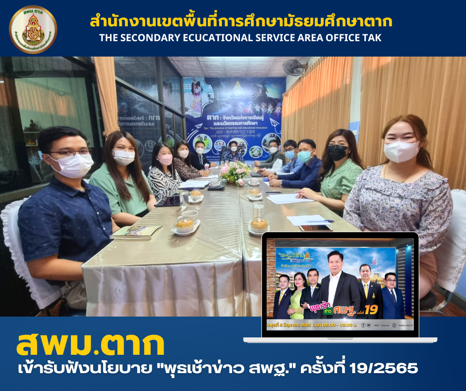 “พุธเช้าข่าว สพฐ.” ครั้งที่ 19/2565 วรวุฒิ เนื้อนิ่ม 9 มิถุนายน 2565 วันที่ 8 มิถุนายน 2565 ดร.อวยชัย ศรีตระกูล ผอ.สพม.ตาก พร้อมด้วย รอง ผอ.สพม.ตาก ผอ.กลุ่มงาน และบุคลากร ร่วมรับฟังนโยบาย ของ สพฐ. ในรายการ “พุธเช้า–ข่าวสพฐ.” ครั้งที่ 19/2565 ผ่านระบบออนไลน์ ณ ห้องประชุมลานสาง สพม.ตาก จำนวนคนดู 0