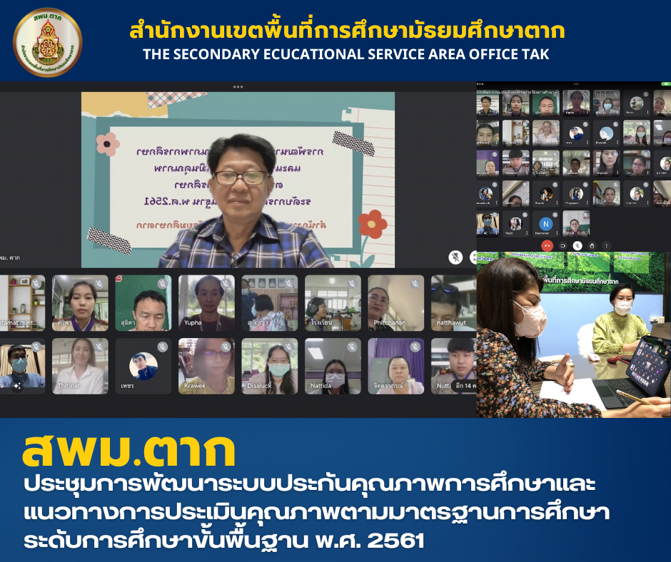 วันที่ 8 มิถุนายน 2565 กลุ่มนิเทศ ติดตาม และประเมินผล สพม.ตาก จัดประชุมการพัฒนาระบบประกันคุณภาพการศึกษาและแนวทางการประเมินคุณภาพตามมาตรฐานการศึกษาระดับการศึกษาขั้นพื้นฐาน พ.ศ. 2561ให้กับโรงเรียนในสังกัด โดยมี ดร.อวยชัย ศรีตระกูล ผอ.สพม.ตาก เป็นประธานเปิดการประชุม ผ่านช่องทางออนไลน์