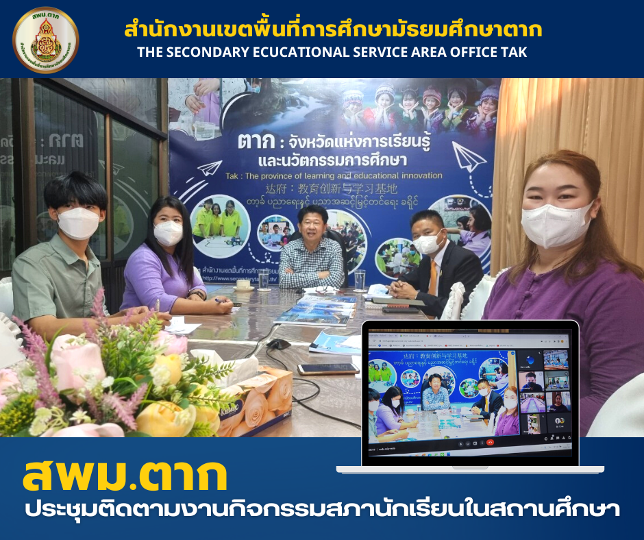 14 มิถุนายน 2565 ดร.อวยชัย ศรีตระกูล ผอ.สพม.ตาก พร้อมด้วย นายเอกชัย ใจก๋องแก้ว รอง ผอ. สพม.ตาก พร้อมด้วยกลุ่ม ส่งเสริมการจัดการศึกษา จัดประชุมติดตามกิจกรรมสภานักเรียนในสถานศึกษา โดยมีครูผู้รับผิดชอบงานสภานักเรียน คณะกรรมการสภานักเรียน ร่วมประชุมผ่านทางช่องทางออนไลน์ ณ ห้องประชุมลานสาง