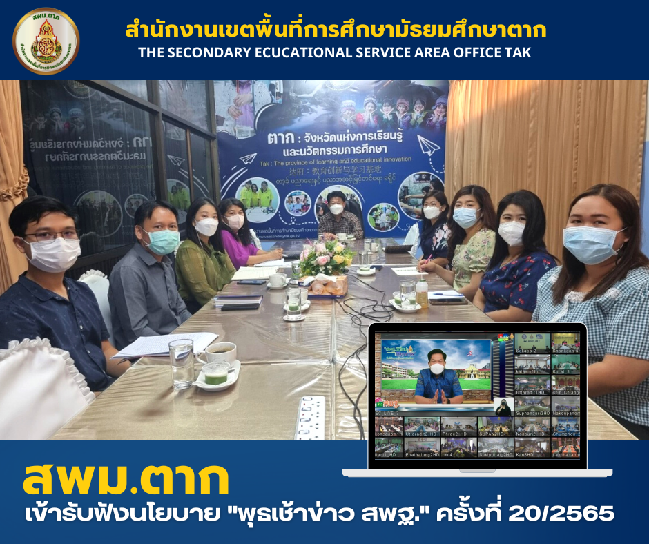 เข้ารับฟังนโยบาย “พุธเช้าข่าว สพฐ.” ครั้งที่ 20/2565 วรวุฒิ เนื้อนิ่ม 15 มิถุนายน 2565 15 มิถุนายน 2565 ดร.อวยชัย ศรีตระกูล ผอ.สพม.ตาก พร้อมด้วย รอง ผอ.สพม.ตาก ผอ.กลุ่มงาน และบุคลากร ร่วมรับฟังนโยบาย ของ สพฐ. ในรายการ “พุธเช้า–ข่าวสพฐ.” ครั้งที่ 20/2565 ผ่านระบบออนไลน์ ณ ห้องประชุมลานสาง สพม.ตาก จำนวนคนดู 1