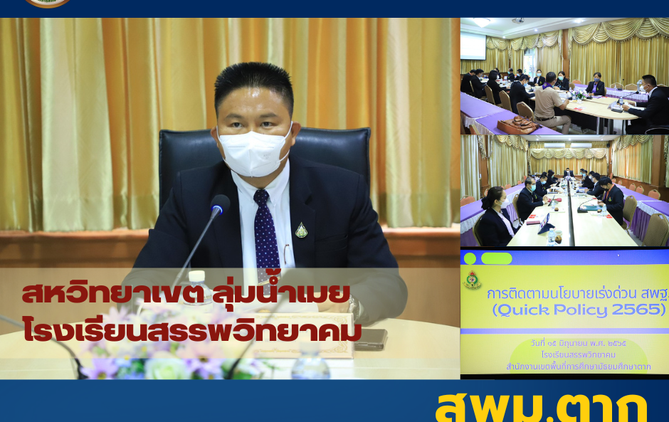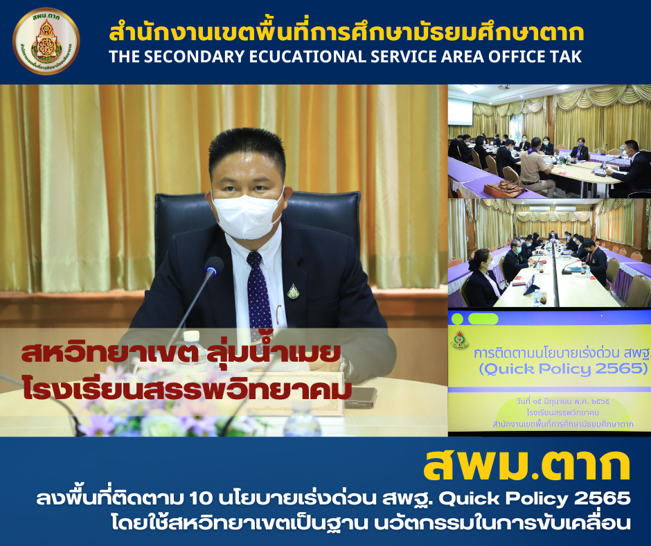 วันที่ 15 มิถุนายน 2565 นายเอกชัย ใจก๋องแก้ว รอง ผอ.สพม.ตาก พร้อมด้วยคณะกรรมการติดตาม และประเมินผลนโยบายฯ สหวิทยาเขตลุ่มน้ำเมย ลงพื้นที่ติดตาม 10 นโยบายเร่งด่วน สพฐ. Quick Policy 2565 โดยใช้สหวิทยาเขตเป็นฐาน นวัตกรรมในการขับเคลื่อน ณ โรงเรียนสรรพวิทยาคม และโรงเรียนแม่ปะวิทยาคม ตามลำดับ