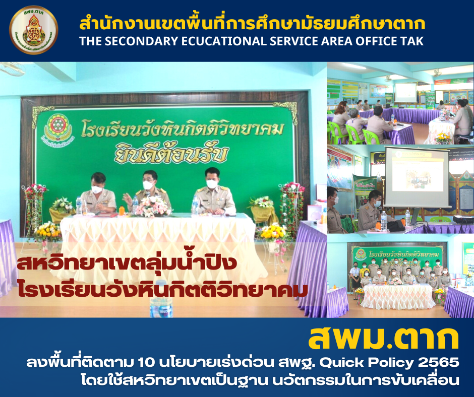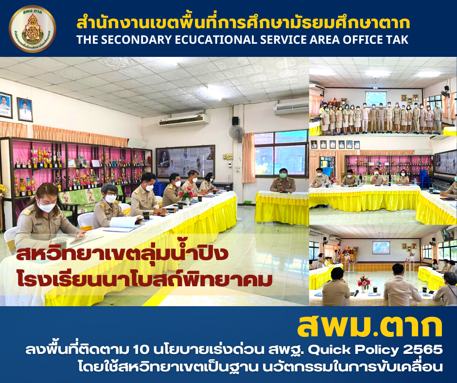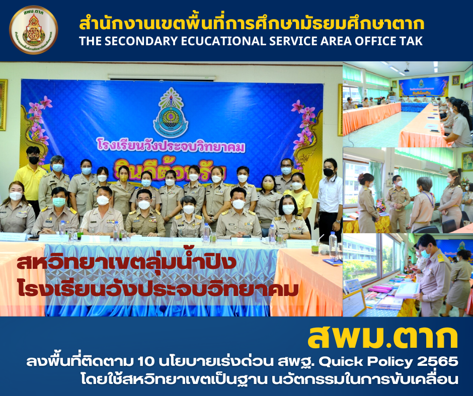 วันที่ 20 มิถุนายน 2565 ดร.ศราวุธ คำแก้ว รอง ผอ.สพม.ตาก พร้อมด้วยคณะกรรมการติดตาม และประเมินผลนโยบายฯ สหวิทยาเขตลุ่มน้ำปิง ลงพื้นที่ติดตาม 10 นโยบายเร่งด่วน สพฐ. Quick Policy 2565 โดยใช้สหวิทยาเขตเป็นฐาน นวัตกรรมในการขับเคลื่อน ณ โรงเรียนวังประจบวิทยาคม โรงเรียนวังหินกิตติวิทยาคม และโรงเรียนนาโบสถ์พิทยาคม ตามลำดับ
