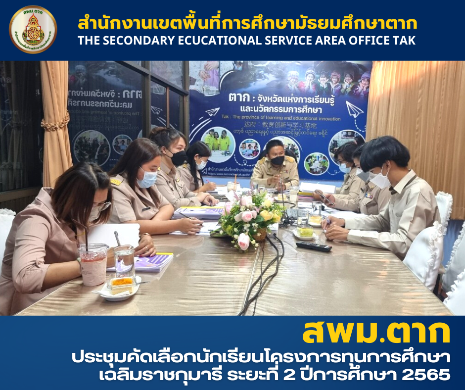 วันที่ 20 มิถุนายน 2565 นายเอกชัย ใจก๋องแก้ว รอง ผอ.สพม.ตาก เป็นประธานประชุมคัดเลือกนักเรียน โครงการทุนการศึกษาเฉลิมราชกุมารี ระยะที่ 2 ปีการศึกษา 2565 โดยมีคณะกรรมการจาก สพม.ตาก สพป.ตากเขต 2 และนักเรียนคัดเลือกทุน จำนวน 12 ราย ผ่านทางช่องทาง google meet ณ ห้องประชุมลานสาง สพม.ตาก
