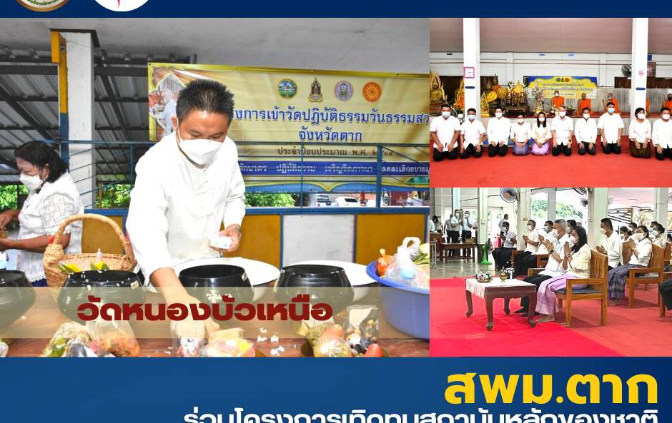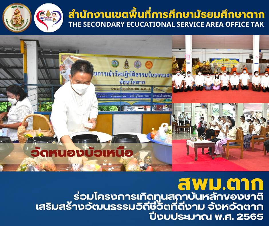 วันที่ 28 มิถุนายน 2565 นายเอกชัย ใจก๋องแก้ว รอง ผอ.สพม.ตาก เข้าร่วมโครงการเทิดทูนสถาบันหลักของชาติ เสริมสร้างวัฒนธรรมวิถีชีวิตที่ดีงาม จังหวัดตาก ปีงบประมาณ พ.ศ. 2565 เพื่อเทิดทูนสถาบันหลักของชาติ และส่งเสริมพลัง “บวร“ บ้าน วัด โรงเรียน โดยให้วัดมีบทบาทในการเป็นพิพิธภัณฑ์ที่มีชีวิตเป็นแหล่งเรียนรู้ศีลธรรม คุณธรรม จริยธรรมและวัฒนธรรม จังหวัดตาก และสนับสนุนให้พุทธคาสนิกชนเข้าวัดปฏิบัติธรรม ฟังพระธรรมเทศนา ทำบุญตักบาตรพัฒนาจิตใจ มีคุณธรรมและมีจริยธรรม ณ วัดหนองบัวเหนือ ตำบลหนองบัวเหนือ อำเภอเมืองตาก จังหวัดตาก