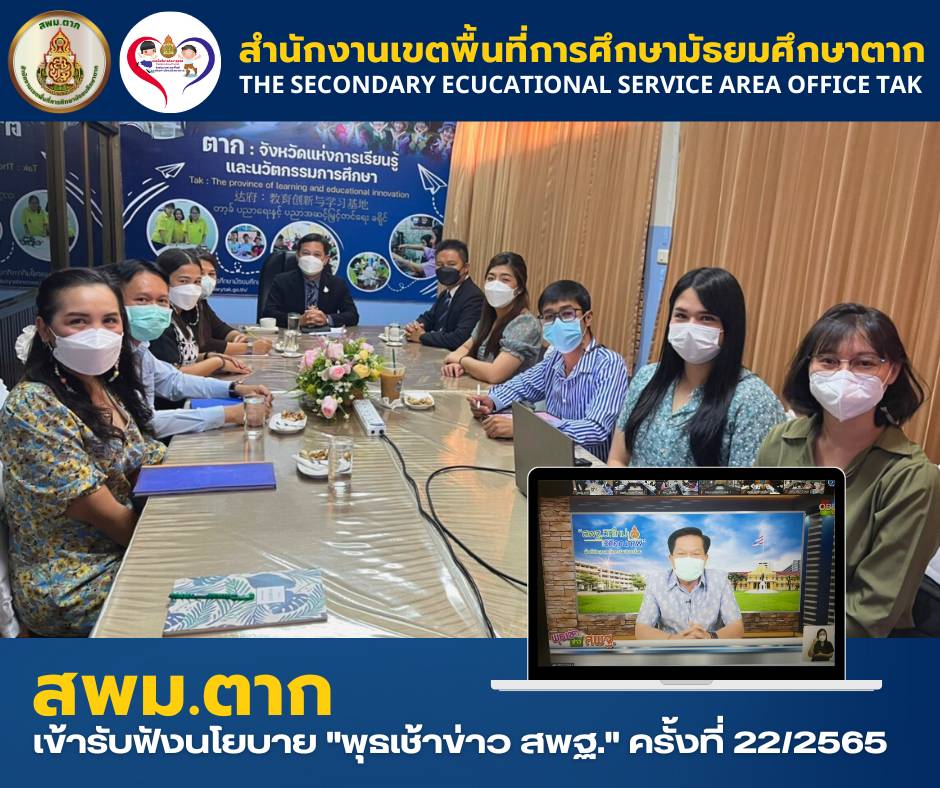 29 มิถุนายน 2565 ดร.อวยชัย ศรีตระกูล ผอ.สพม.ตาก มอบหมายให้ นายวัลลภ เอี่ยมมะ รอง ผอ.สพม.ตาก พร้อมด้วย นายเอกชัย ใจก๋องแก้ว รอง ผอ.สพม.ตาก ผอ.กลุ่มงาน และบุคลากร ร่วมรับฟังนโยบาย ของ สพฐ. ในรายการ “พุธเช้า–ข่าวสพฐ.” ครั้งที่ 22/2565 ผ่านระบบออนไลน์ ณ ห้องประชุมลานสาง สพม.ตาก