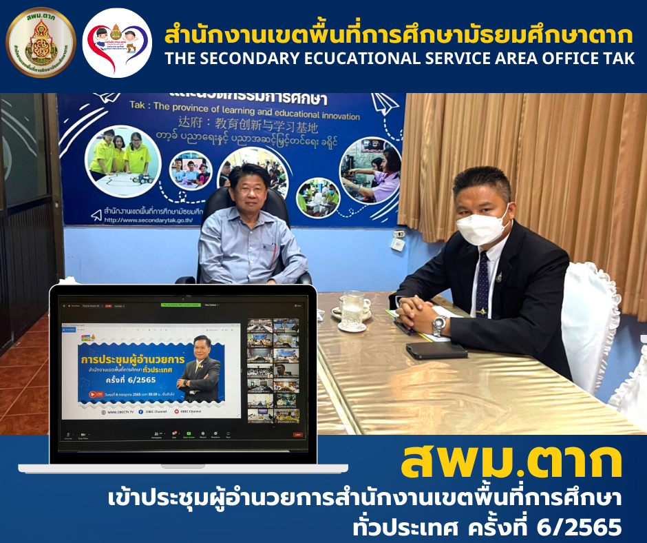 วันที่ 6 กรกฎาคม 2565 ดร.อวยชัย ศรีตระกูล ผอ.สพม.ตาก พร้อมด้วย นายเอกชัย ใจก๋องแก้ว รอง ผอ.สพม.ตาก เข้าประชุมผู้อำนวยการสำนักงานเขตพื้นที่การศึกษา ทั่วประเทศครั้งที่ 6/2565 รับฟังข้อชี้แจงนโยบาย สพฐ. โดยมี นายอัมพร พินะสา เป็นประธานการประชุม ผ่านช่องทาง Zoom meeting