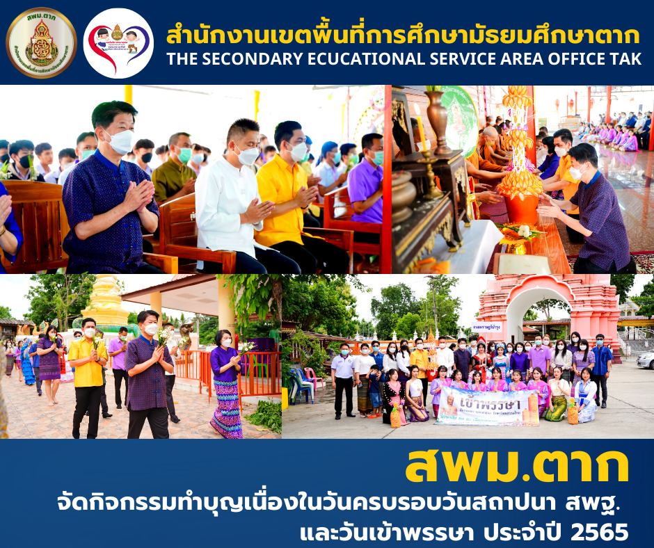 วันที่ 7 กรกฎาคม 2565 ดร.อวยชัย ศรีตระกูล ผู้อำนวยการสำนักงานเขตพื้นที่การศึกษามัธยมศึกษาตาก นายเอกชัย ใจก๋องแก้ว รองผู้อำนวยการสำนักงานเขตพื้นที่การศึกษามัธยมศึกษาตาก พร้อมด้วยบุคลากรในสังกัด ร่วมกับผู้บริหารสถานศึกษา คณะครู นักเรียน โรงเรียนถนอมราษฎร์บำรุง จัดกิจกรรมทำบุญเนื่องในโอกาสวันคล้ายวันสถาปนา สำนักงานคณะกรรมการการศึกษาขั้นพื้นฐาน (สพฐ.) ครบรอบ 19 ปี และถวายเทียนพรรษาเนื่องในวันเข้าพรรษา เพื่อสืบสานประเพณีปฏิบัติของชาวพุทธที่ได้เริ่มกระทำมาตั้งแต่พุทธกาล ณ วัดดอยคีรี อำเภอเมือง จังหวัดตาก