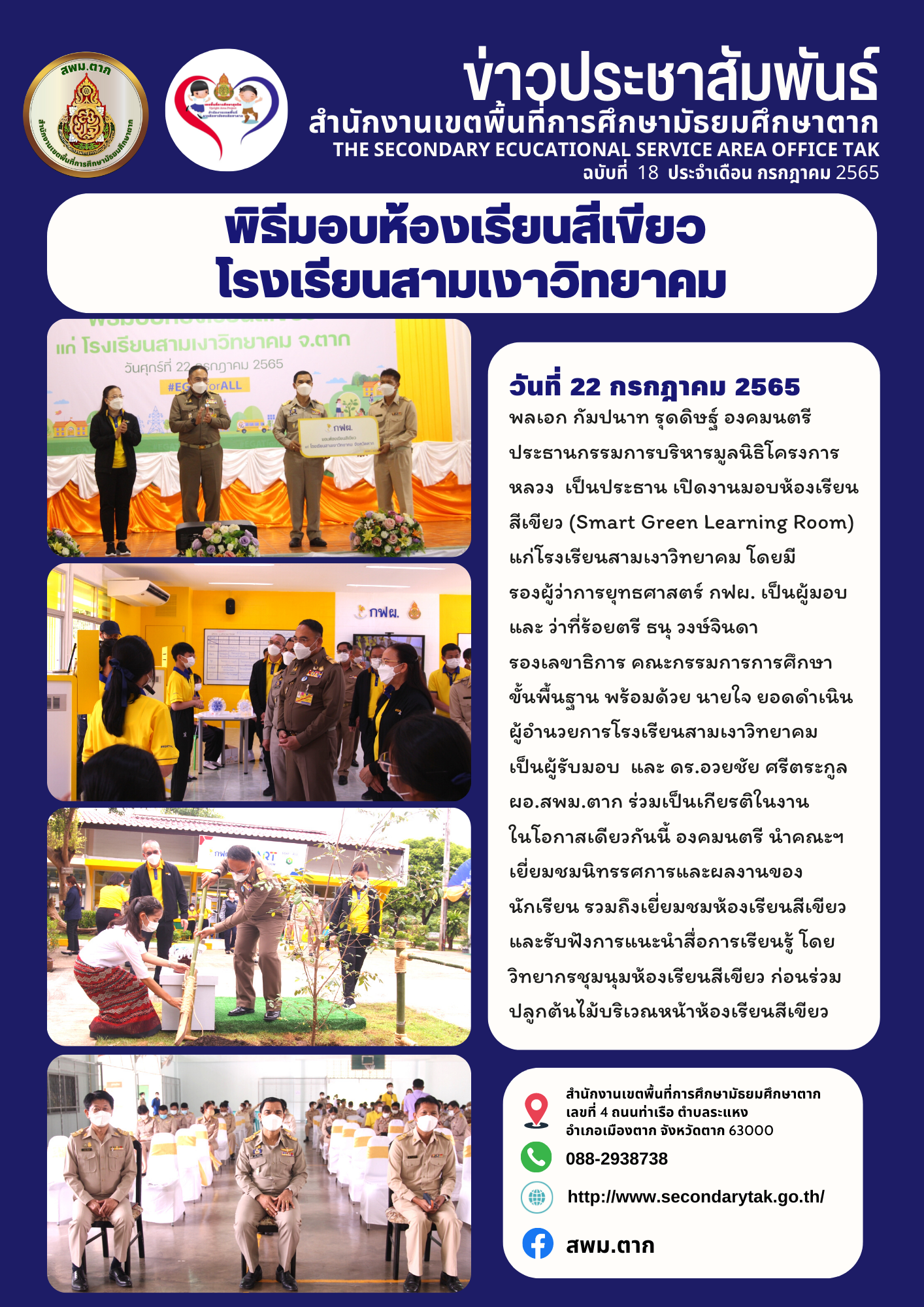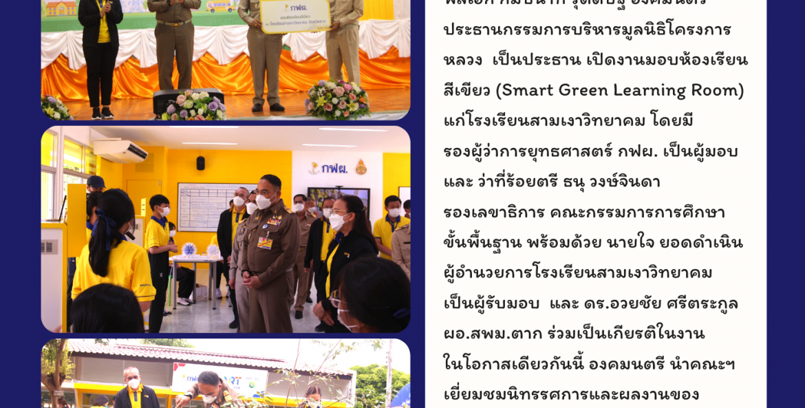 พลเอก กัมปนาท รุดดิษฐ์ องคมนตรี ประธานกรรมการบริหารมูลนิธิโครงการหลวง เป็นประธาน เปิดงานมอบห้องเรียนสีเขียว (Smart Green Learning Room) แก่โรงเรียนสามเงาวิทยาคม โดยมี รองผู้ว่าการยุทธศาสตร์ กฟผ. เป็นผู้มอบ และ ว่าที่ร้อยตรี ธนุ วงษ์จินดา รองเลขาธิการ คณะกรรมการการศึกษา ขั้นพื้นฐาน พร้อมด้วย นายใจ ยอดดำเนิน ผู้อำนวยการโรงเรียนสามเงาวิทยาคม เป็นผู้รับมอบ และ ดร.อวยชัย ศรีตระกูล ผอ.สพม.ตาก ร่วมเป็นเกียรติในงาน ในโอกาสเดียวกันนี้ องคมนตรี นำคณะฯ เยี่ยมชมนิทรรศการและผลงานของนักเรียน รวมถึงเยี่ยมชมห้องเรียนสีเขียว และรับฟังการแนะนำสื่อการเรียนรู้ โดยวิทยากรชุมนุมห้องเรียนสีเขียว ก่อนร่วมปลูกต้นไม้บริเวณหน้าห้องเรียนสีเขียว