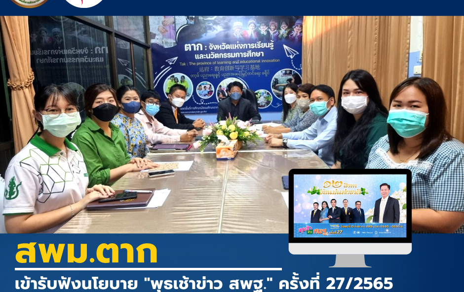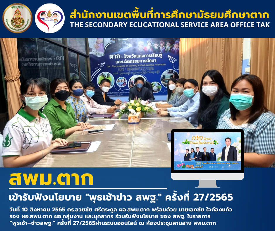 พุธเช้าข่าว สพฐ ครั้งที่ 272565 วรวุฒิ เนื้อนิ่ม 10 สิงหาคม 2565 วันที่ 10 สิงหาคม 2565 ดร.อวยชัย ศรีตระกูล ผอ.สพม.ตาก พร้อมด้วย นายเอกชัย ใจก๋องแก้ว รอง ผอ.สพม.ตาก ผอ.กลุ่มงาน และบุคลากร ร่วมรับฟังนโยบาย ของ สพฐ. ในรายการ“พุธเช้า–ข่าวสพฐ.” ครั้งที่ 27/2565ผ่านระบบออนไลน์ ณ ห้องประชุมลานสาง สพม.ตาก จำนวนคนดู 0