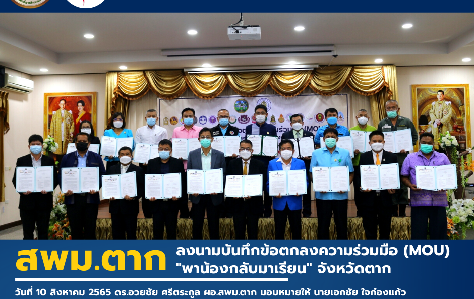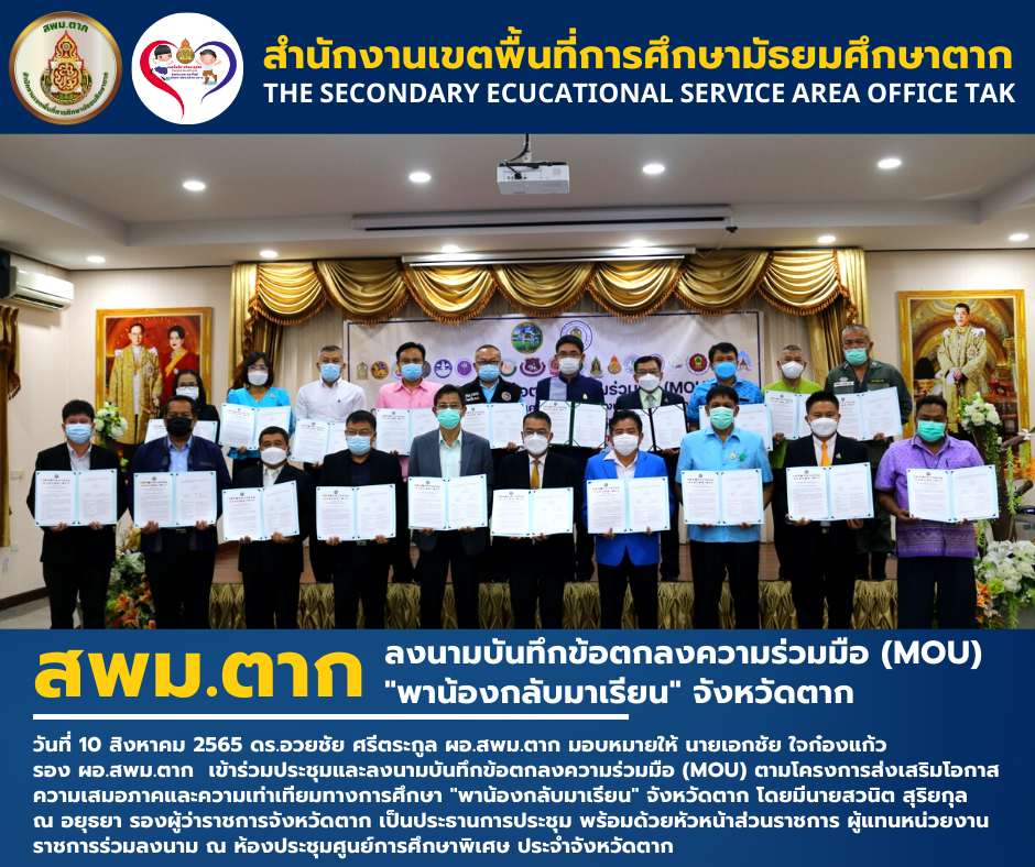 วันที่ 10 สิงหาคม 2565 ดร.อวยชัย ศรีตระกูล ผอ.สพม.ตาก มอบหมายให้ นายเอกชัย ใจก๋องแก้ว รอง ผอ.สพม.ตาก เข้าร่วมประชุมและลงนามบันทึกข้อตกลงความร่วมมือ (MOU) ตามโครงการส่งเสริมโอกาส ความเสมอภาคและความเท่าเทียมทางการศึกษา “พาน้องกลับมาเรียน” จังหวัดตาก โดยมีนายสวนิต สุริยกุล ณ อยุธยา รองผู้ว่าราชการจังหวัดตาก เป็นประธานการประชุม พร้อมด้วยหัวหน้าส่วนราชการ ผู้แทนหน่วยงานราชการร่วมลงนาม ณ ห้องประชุมศูนย์การศึกษาพิเศษ ประจำจังหวัดตาก