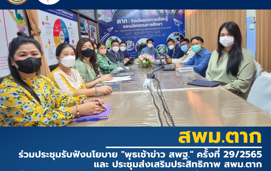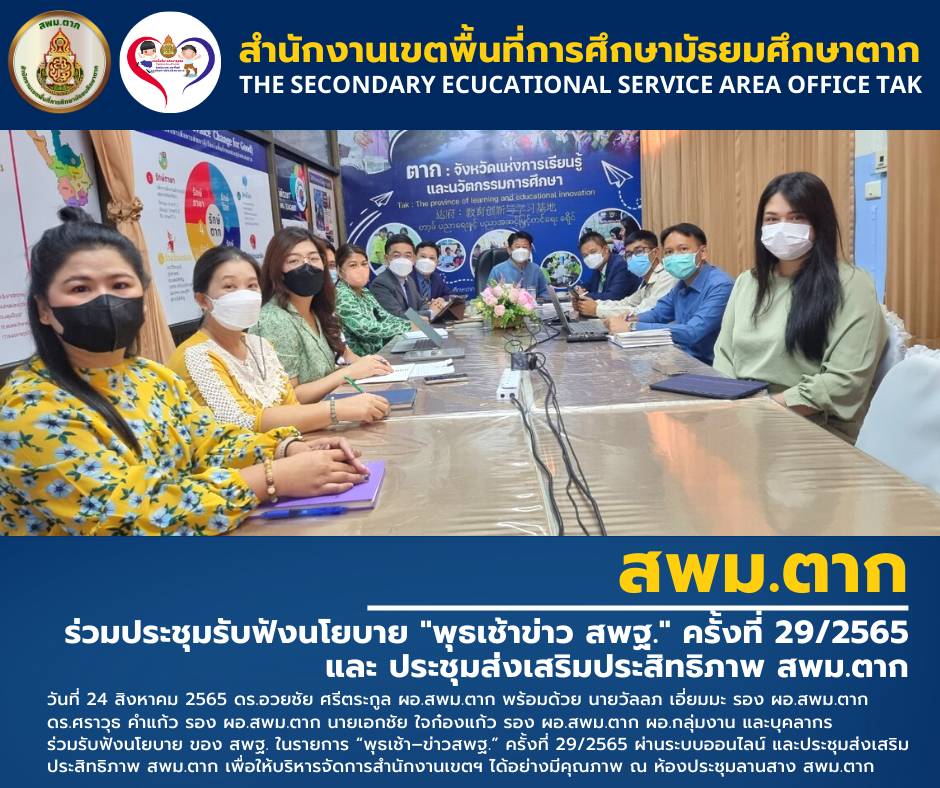วันที่ 24 สิงหาคม 2565 ดร.อวยชัย ศรีตระกูล ผอ.สพม.ตาก พร้อมด้วย นายวัลลภ เอี่ยมมะ รอง ผอ.สพม.ตาก ดร.ศราวุธ คำแก้ว รอง ผอ.สพม.ตาก นายเอกชัย ใจก๋องแก้ว รอง ผอ.สพม.ตาก ผอ.กลุ่มงาน และบุคลากร ร่วมรับฟังนโยบาย ของ สพฐ. ในรายการ “พุธเช้า–ข่าวสพฐ.” ครั้งที่ 29/2565 ผ่านระบบออนไลน์ และประชุมส่งเสริม