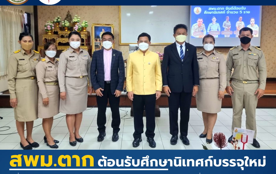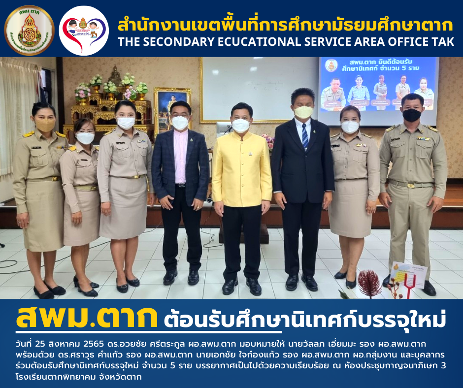 วันที่ 25 สิงหาคม 2565 ดร.อวยชัย ศรีตระกูล ผอ.สพม.ตาก มอบหมายให้ นายวัลลภ เอี่ยมมะ รอง ผอ.สพม.ตาก พร้อมด้วย ดร.ศราวุธ คำแก้ว รอง ผอ.สพม.ตาก นายเอกชัย ใจก๋องแก้ว รอง ผอ.สพม.ตาก ผอ.กลุ่มงาน และบุคลากร ร่วมต้อนรับศึกษานิเทศก์บรรจุใหม่ จำนวน 5 ราย บรรยากาศเป็นไปด้วยความเรียบร้อย ณ ห้องประชุมกาญจนาภิเษก 3 โรงเรียนตากพิทยาคม จังหวัดตาก