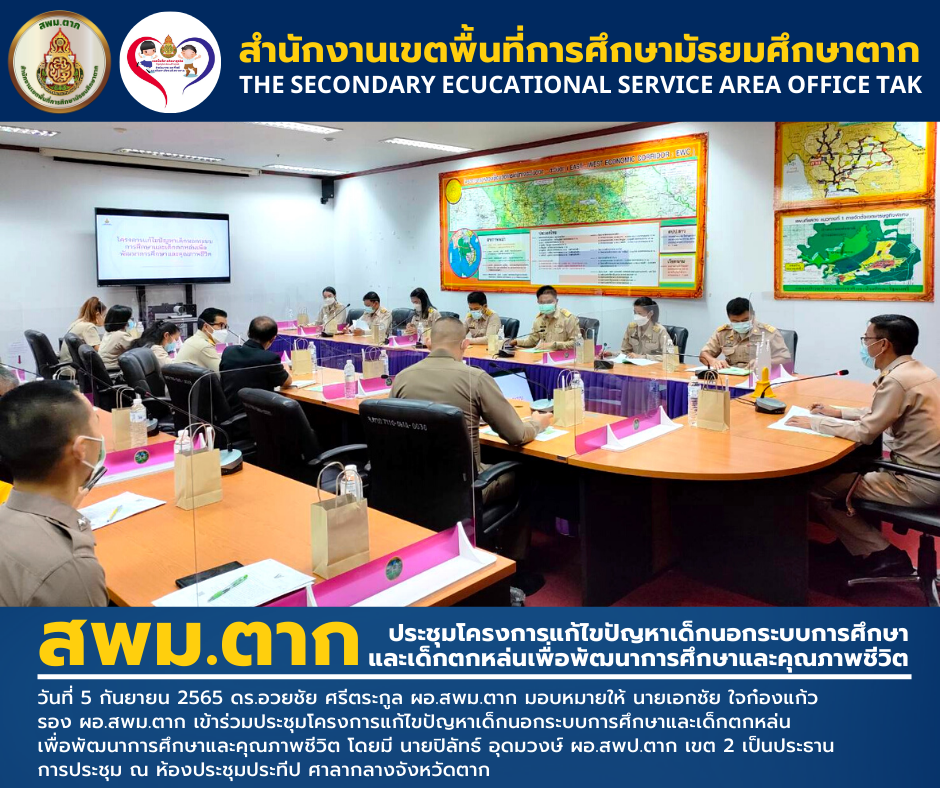 วันที่ 5 กันยายน 2565 ดร.อวยชัย ศรีตระกูล ผอ.สพม.ตาก มอบหมายให้ นายเอกชัย ใจก๋องแก้ว รอง ผอ.สพม.ตาก เข้าร่วมประชุมโครงการแก้ไขปัญหาเด็กนอกระบบการศึกษาและเด็กตกหล่น เพื่อพัฒนาการศึกษาและคุณภาพชีวิต โดยมี นายปิลัทธ์ อุดมวงษ์ ผอ.สพป.ตาก เขต 2 เป็นประธานการประชุม ณ ห้องประชุมประทีป ศาลากลางจังหวัดตาก