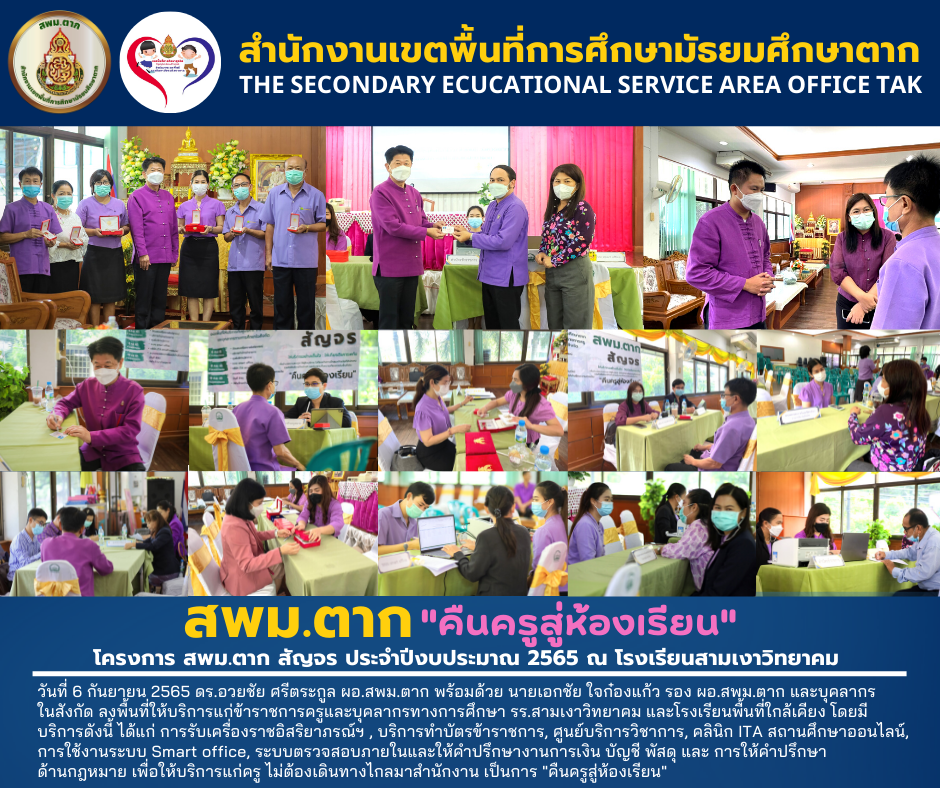 วันที่ 6 กันยายน 2565 ดร.อวยชัย ศรีตระกูล ผอ.สพม.ตาก พร้อมด้วย นายเอกชัย ใจก๋องแก้ว รอง ผอ.สพม.ตาก และบุคลากร ในสังกัด ลงพื้นที่ให้บริการแก่ข้าราชการครูและบุคลากรทางการศึกษา รร.สามเงาวิทยาคม และโรงเรียนพื้นที่ใกล้เคียง โดยมีบริการดังนี้ ได้แก่ การรับเครื่องราชอิสริยาภรณ์ฯ , บริการทำบัตรข้าราชการ, ศูนย์บริการวิชาการ, คลินิก ITA สถานศึกษาออนไลน์,การใช้งานระบบ Smart office, ระบบตรวจสอบภายในและให้คำปรึกษางานการเงิน บัญชี พัสดุ และ การให้คำปรึกษา