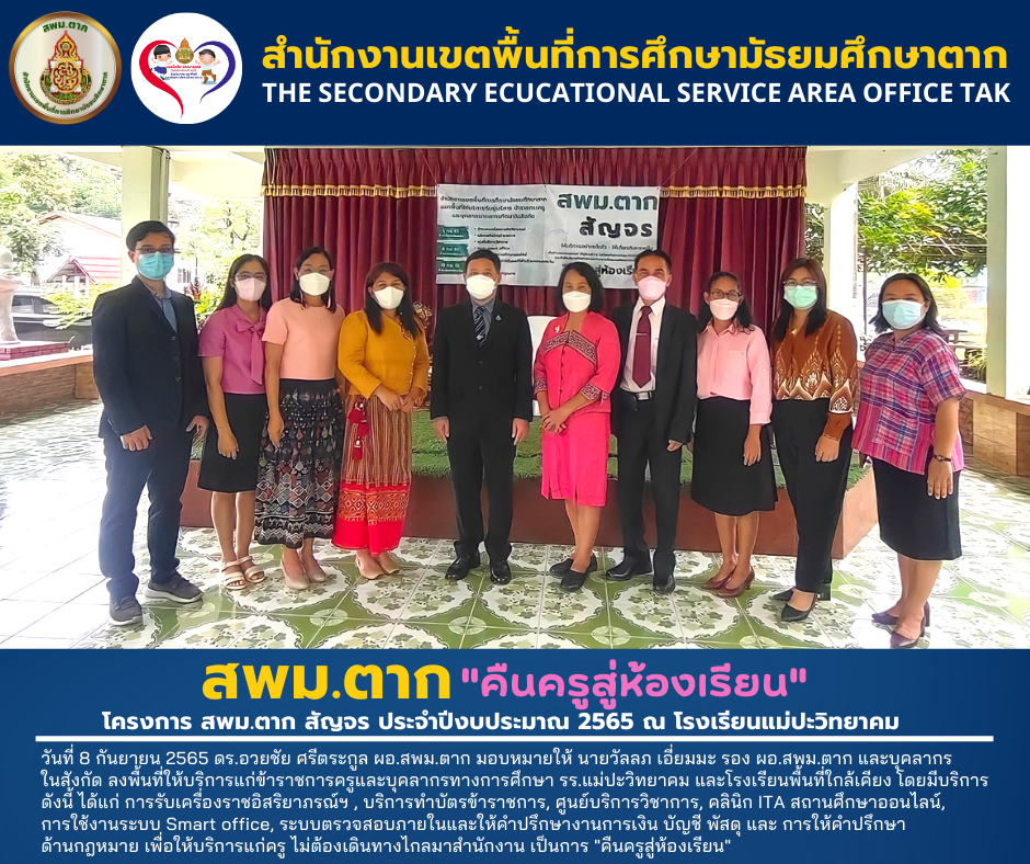 วันที่ 8 กันยายน 2565 ดร.อวยชัย ศรีตระกูล ผอ.สพม.ตาก มอบหมายให้ นายวัลลภ เอี่ยมมะ รอง ผอ.สพม.ตาก และบุคลากร ในสังกัด ลงพื้นที่ให้บริการแก่ข้าราชการครูและบุคลากรทางการศึกษา รร.แม่ปะวิทยาคม และโรงเรียนพื้นที่ใกล้เคียง โดยมีบริการดังนี้ ได้แก่ การรับเครื่องราชอิสริยาภรณ์ฯ , บริการทำบัตรข้าราชการ, ศูนย์บริการวิชาการ, คลินิก ITA สถานศึกษาออนไลน์,การใช้งานระบบ Smart office, ระบบตรวจสอบภายในและให้คำปรึกษางานการเงิน บัญชี พัสดุ และ การให้คำปรึกษาด้านกฎหมาย เพื่อให้บริการแก่ครู ไม่ต้องเดินทางไกลมาสำนักงาน เป็นการ “คืนครูสู่ห้องเรียน”
