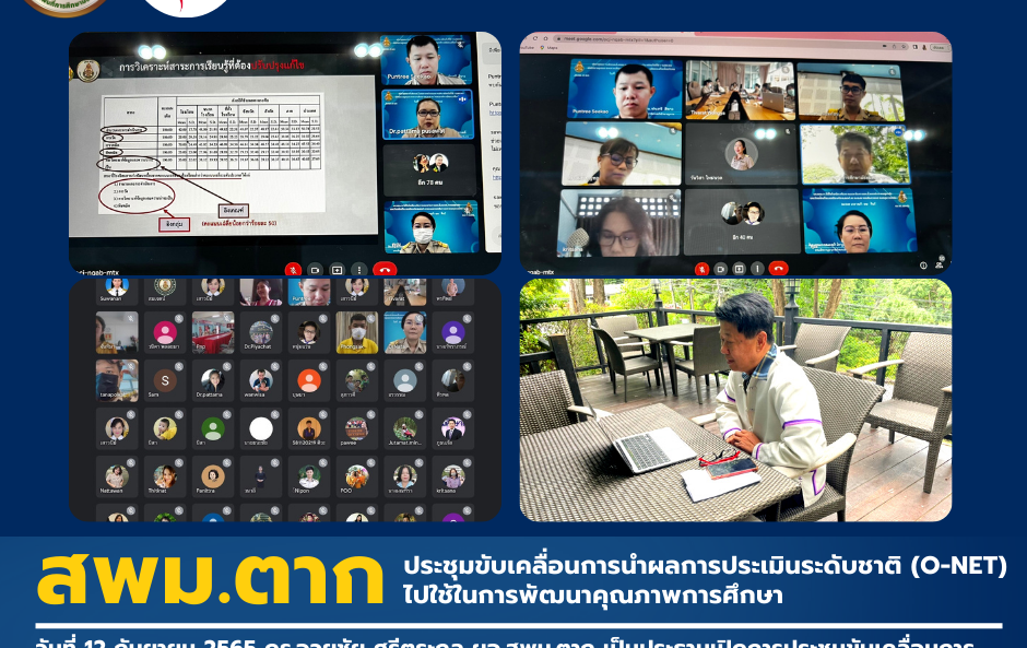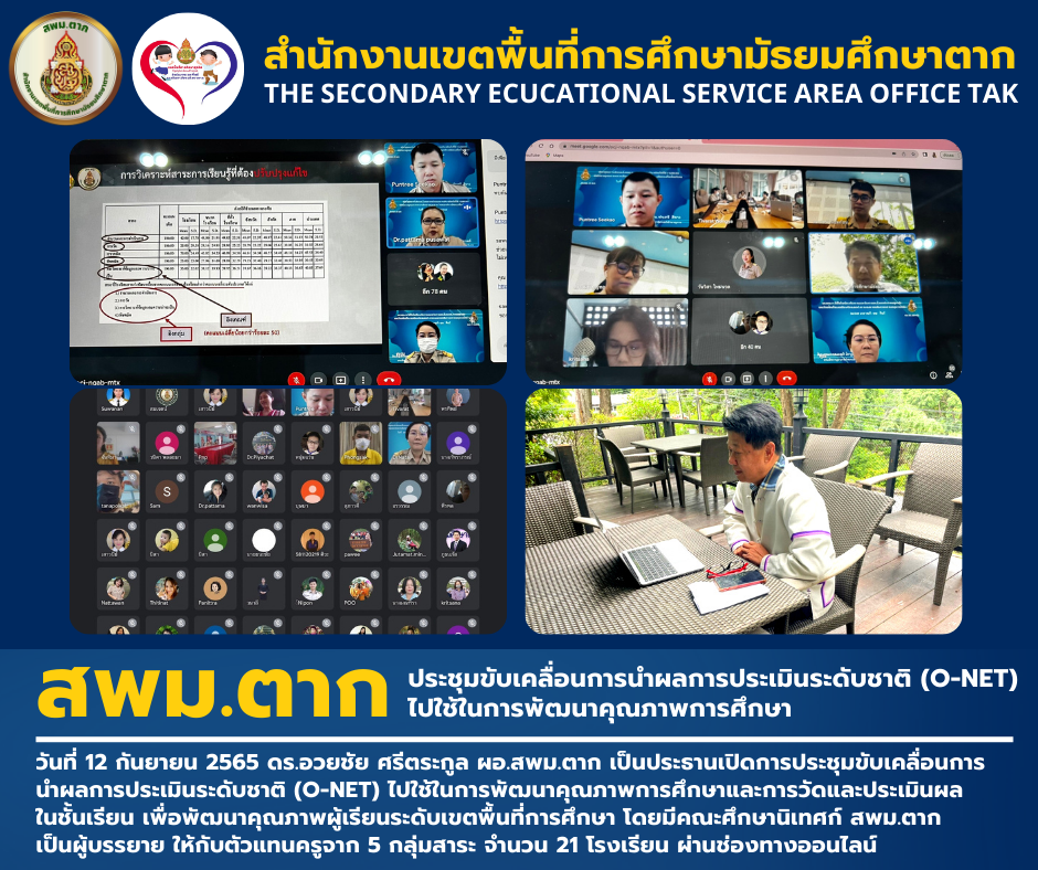 วันที่ 12 กันยายน 2565 ดร.อวยชัย ศรีตระกูล ผอ.สพม.ตาก เป็นประธานเปิดการประชุมขับเคลื่อนการนำผลการประเมินระดับชาติ (O-NET) ไปใช้ในการพัฒนาคุณภาพการศึกษาและการวัดและประเมินผลในชั้นเรียน เพื่อพัฒนาคุณภาพผู้เรียนระดับเขตพื้นที่การศึกษา โดยมีคณะศึกษานิเทศก์ สพม.ตาก เป็นผู้บรรยาย ให้กับตัวแทนครูจาก 5 กลุ่มสาระ จำนวน 21 โรงเรียน ผ่านช่องทางออนไลน์