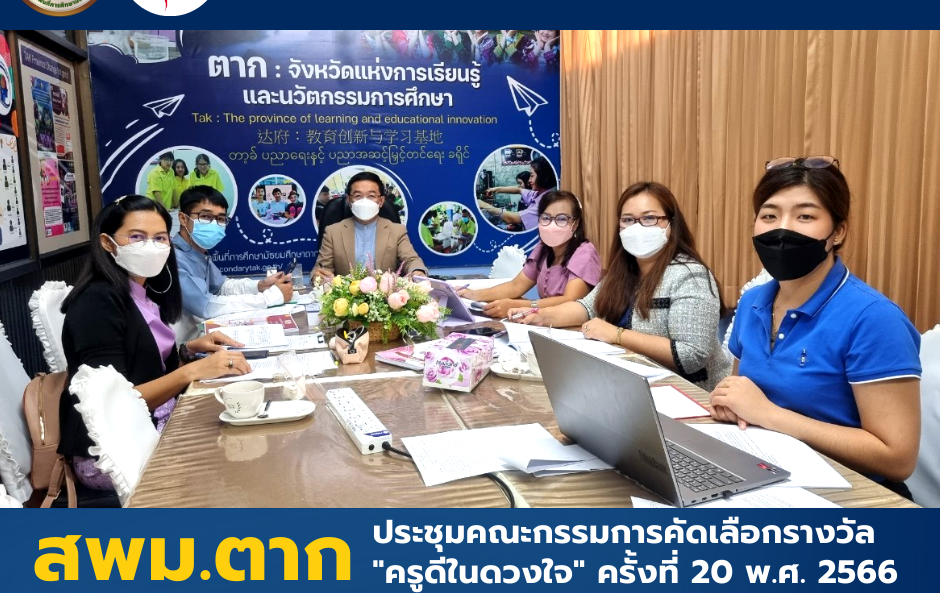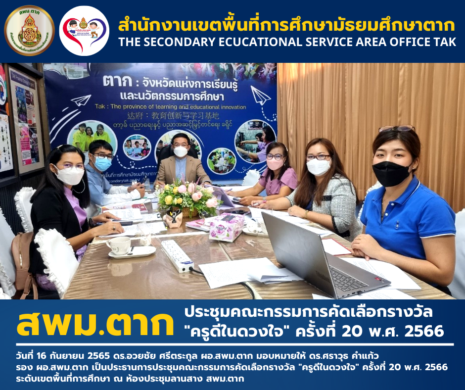 ประชุมคณะกรรมการคัดเลือกรางวัล “ครูดีในดวงใจ” ครั้งที่ 20 วรวุฒิ เนื้อนิ่ม 16 กันยายน 2565 วันที่ 16 กันยายน 2565 ดร.อวยชัย ศรีตระกูล ผอ.สพม.ตาก มอบหมายให้ ดร.ศราวุธ คำแก้ว รอง ผอ.สพม.ตาก เป็นประธานการประชุมคณะกรรมการคัดเลือกรางวัล “ครูดีในดวงใจ” ครั้งที่ 20 พ.ศ. 2566 ระดับเขตพื้นที่การศึกษา ณ ห้องประชุมลานสาง สพม.ตาก จำนวนคนดู 9