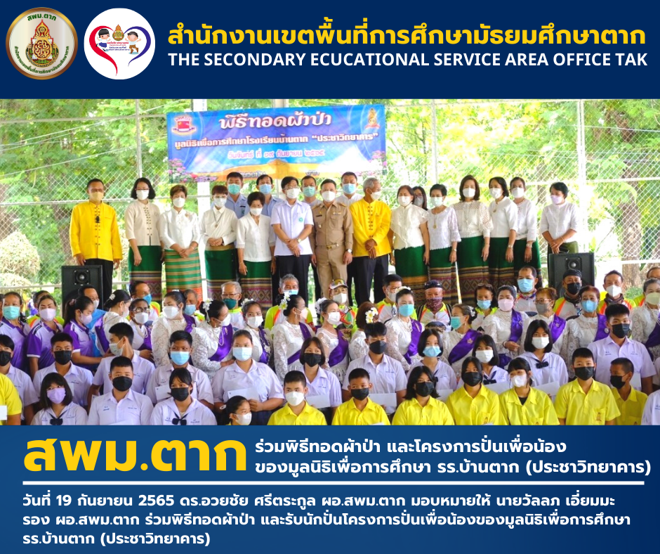 ร่วมพิธีทอดผ้าป่า และโครงการปั่นเพื่อน้อง บ้านตากฯ วรวุฒิ เนื้อนิ่ม 21 กันยายน 2565 วันที่ 19 กันยายน 2565 ดร.อวยชัย ศรีตระกูล ผอ.สพม.ตาก มอบหมายให้ นายวัลลภ เอี่ยมมะ รอง ผอ.สพม.ตาก ร่วมพิธีทอดผ้าป่า และรับนักปั่นโครงการปั่นเพื่อน้องของมูลนิธิเพื่อการศึกษา รร.บ้านตาก (ประชาวิทยาคาร) จำนวนคนดู 0