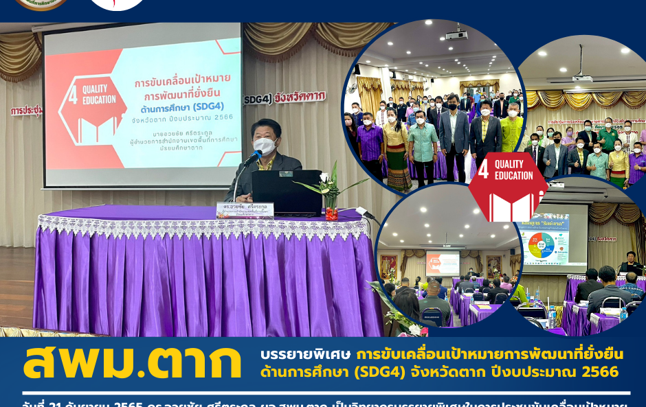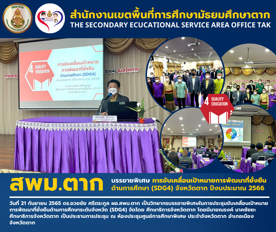 วันที่ 21 กันยายน 2565 ดร.อวยชัย ศรีตระกูล ผอ.สพม.ตาก เป็นวิทยากรบรรยายพิเศษในการประชุมขับเคลื่อนเป้าหมายการพัฒนาที่ยั่งยืนด้านการศึกษาระดับจังหวัด (SDG4) จัดโดย ศึกษาธิการจังหวัดตาก โดยมีนายณรงค์ นาคชัยยะ ศึกษาธิการจังหวัดตาก เป็นประธานการประชุม ณ ห้องประชุมศูนย์การศึกษาพิเศษ ประจำจังหวัดตาก อำเภอเมือง จังหวัดตาก