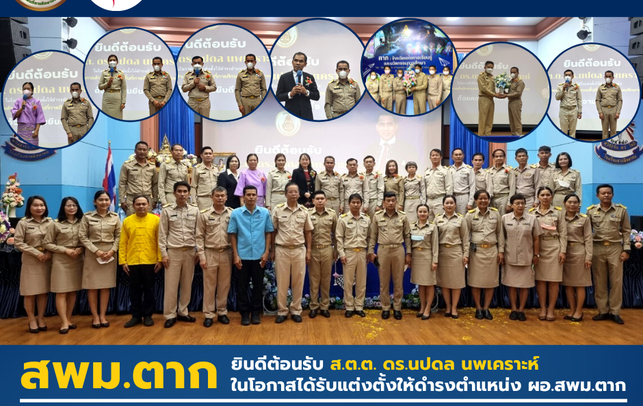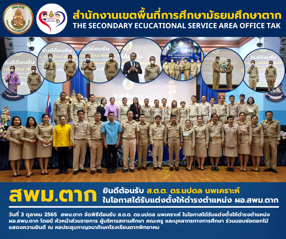 วันที่ 3 ตุลาคม 2565 สพม.ตาก จัดพิธีต้อนรับ ส.ต.ต. ดร.นปดล นพเคราะห์ ในโอกาสได้รับแต่งตั้งให้ดำรงตำแหน่ง ผอ.สพม.ตาก โดยมี หัวหน้าส่วนราชการ ผู้บริหารสถานศึกษา คณะครู และบุคลากรทางการศึกษา ร่วมมอบช่อดอกไม้ แสดงความยินดี ณ หอประชุมกาญจนาภิเษกโรงเรียนตากพิทยาคม