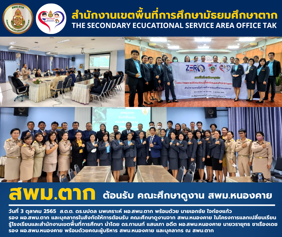 วันที่ 3 ตุลาคม 2565 ส.ต.ต. ดร.นปดล นพเคราะห์ ผอ.สพม.ตาก พร้อมด้วย นายเอกชัย ใจก๋องแก้ว รอง ผอ.สพม.ตาก และบุคลากรในสังกัดให้การต้อนรับ คณะศึกษาดูงานจาก สพม.หนองคาย ในโครงการแลกเปลี่ยนเรียนรู้โรงเรียนและสำนักงานเขตพื้นที่การศึกษา นำโดย ดร.กานนท์ แสนเภา อดีต ผอ.สพม.หนองคาย นายวรายุทธ ชาเรืองเดช รอง ผอ.สพม.หนองคาย พร้อมด้วยคณะผู้บริหาร สพม.หนองคาย และบุคลากร ณ สพม.ตาก