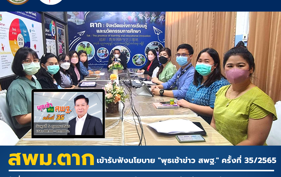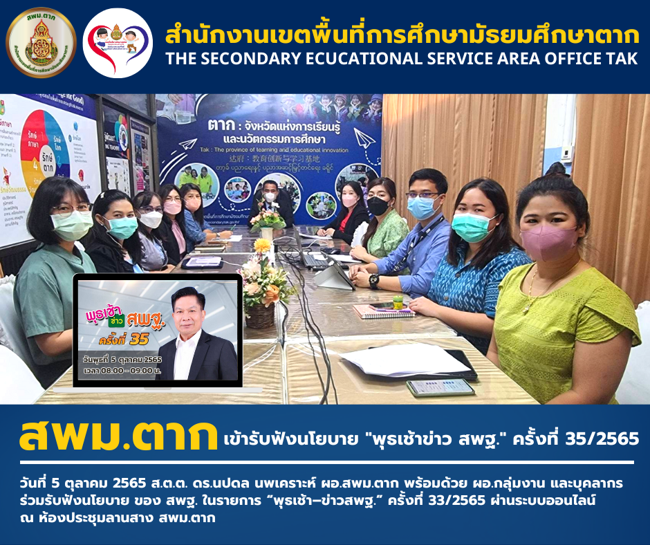 สพม.ตาก เข้ารับฟังนโยบาย “พุธเช้าข่าว สพฐ.” ครั้งที่ 35/2565 วรวุฒิ เนื้อนิ่ม 5 ตุลาคม 2565 วันที่ 5 ตุลาคม 2565 ส.ต.ต. ดร.นปดล นพเคราะห์ ผอ.สพม.ตาก พร้อมด้วย ผอ.กลุ่มงาน และบุคลากร ร่วมรับฟังนโยบาย ของ สพฐ. ในรายการ “พุธเช้า–ข่าวสพฐ.” ครั้งที่ 33/2565 ผ่านระบบออนไลน์ ณ ห้องประชุมลานสาง สพม.ตาก จำนวนคนดู 1