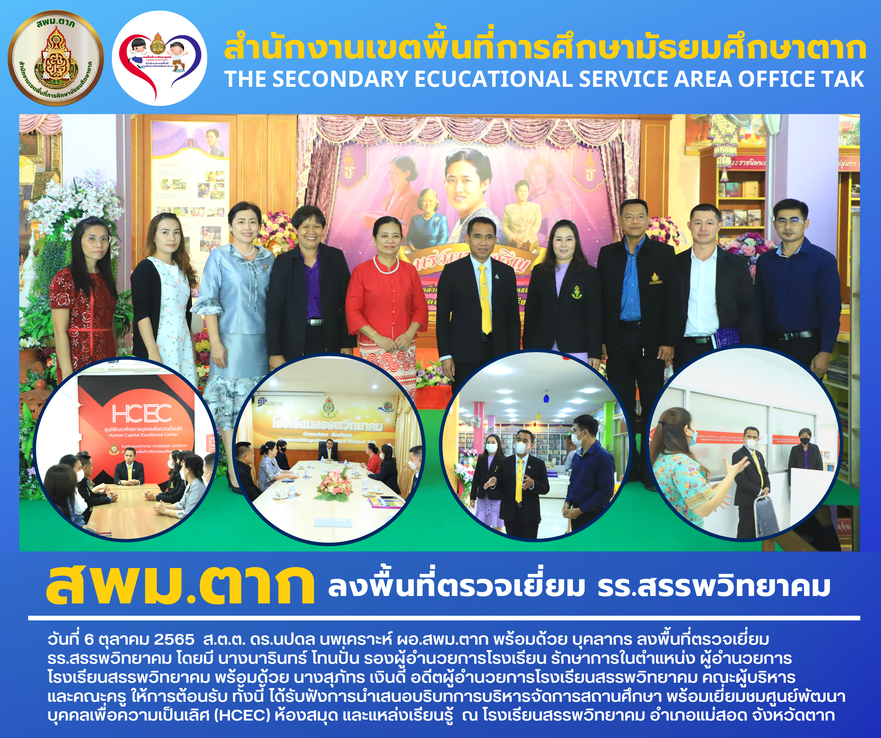 วันที่ 6 ตุลาคม 2565 ส.ต.ต. ดร.นปดล นพเคราะห์ ผอ.สพม.ตาก พร้อมด้วย บุคลากร ลงพื้นที่ตรวจเยี่ยม รร.สรรพวิทยาคม โดยมี นางนารินทร์ โทนปั่น รองผู้อำนวยการโรงเรียน รักษาการในตำแหน่ง ผู้อำนวยการ โรงเรียนสรรพวิทยาคม พร้อมด้วย นางสุภัทร เงินดี อดีตผู้อำนวยการโรงเรียนสรรพวิทยาคม คณะผู้บริหาร และคณะครู ให้การต้อนรับ ทั้งนี้ ได้รับฟังการนำเสนอบริบทการบริหารจัดการสถานศึกษา พร้อมเยี่ยมชมศูนย์พัฒนาบุคคลเพื่อความเป็นเลิศ (HCEC) ห้องสมุด และแหล่งเรียนรู้ ณ โรงเรียนสรรพวิทยาคม อำเภอแม่สอด จังหวัดตาก